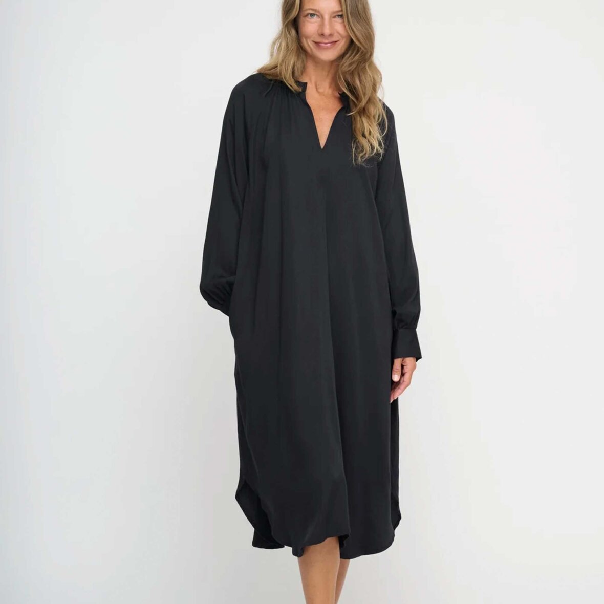 Feminin skjortekjole i et løst snit med v-udskæring og lange, lette ærmer med knapmanchetter. Kjolen har afrundet bundsøm og dekorative plisseringer for- og bagtil, som giver et smukt og elegant fald.