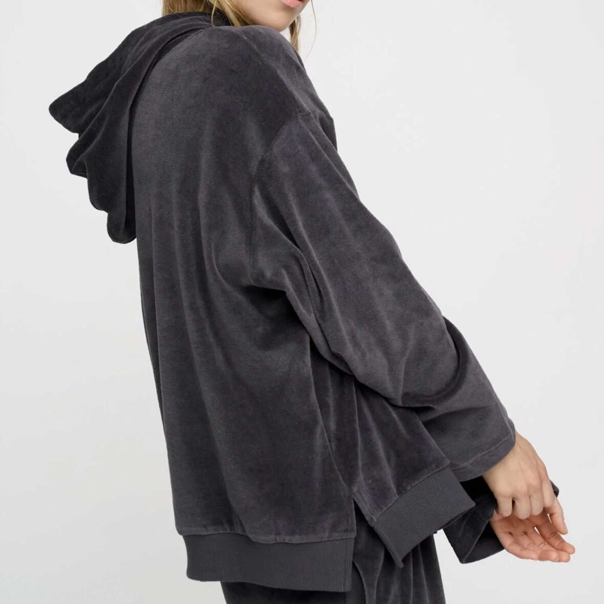 Langærmet, mørkegrå bluse med hætte, brede ærmer og snører. Designet med dekorative slidser i siderne, der giver et afslappet udtryk. En fin basisstyle til både hverdag og blød bevægelse.