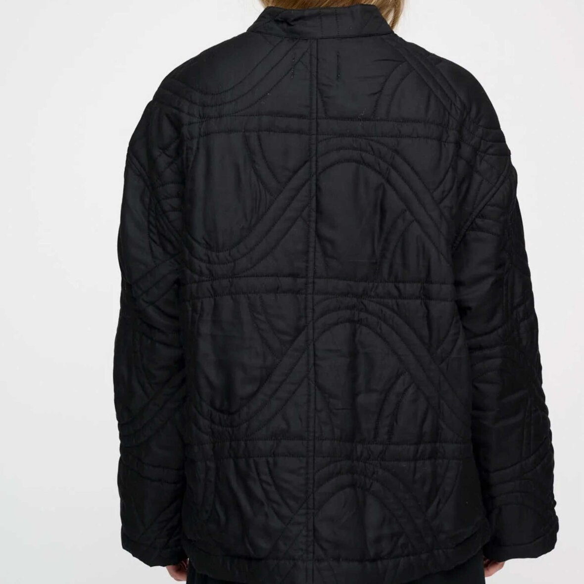 Sort, quiltet kort jakke med sidelommer og dekorativ kinakrave. Det fine mønster i quiltningen giver jakken et elegant udtryk. Pasformen er let oversize og rummelig – perfekt til lag på lag-styling.