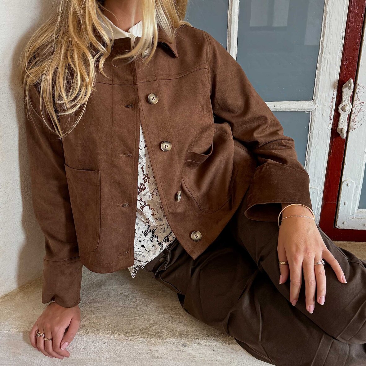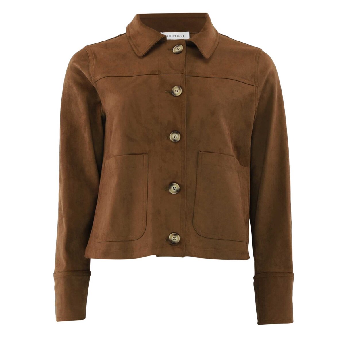 Brun jakke fra Continue med lange ærmer og knappes foran. Jakken er behagelig og nem at style til enhver lejlighed, både til hverdag og mere formelle looks.