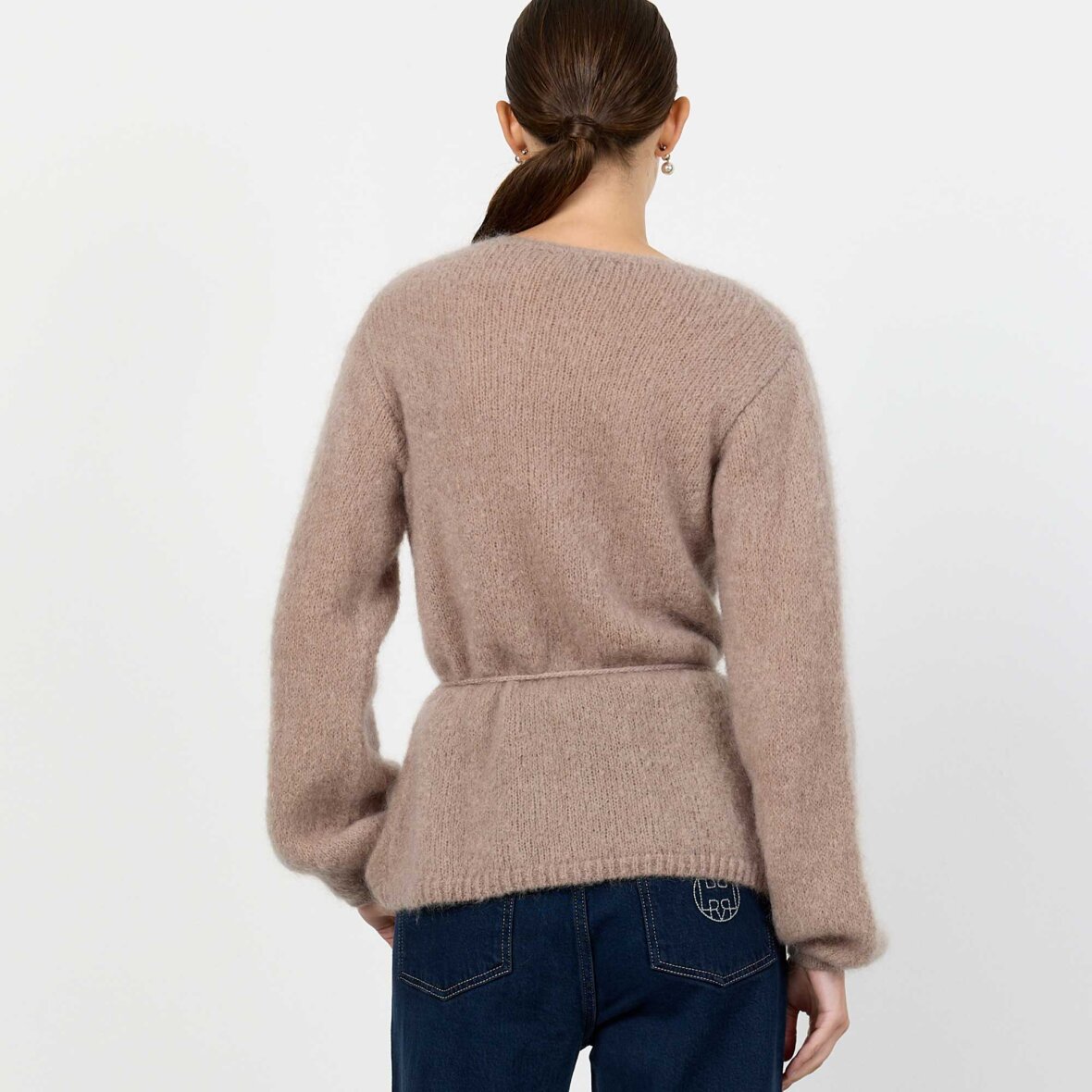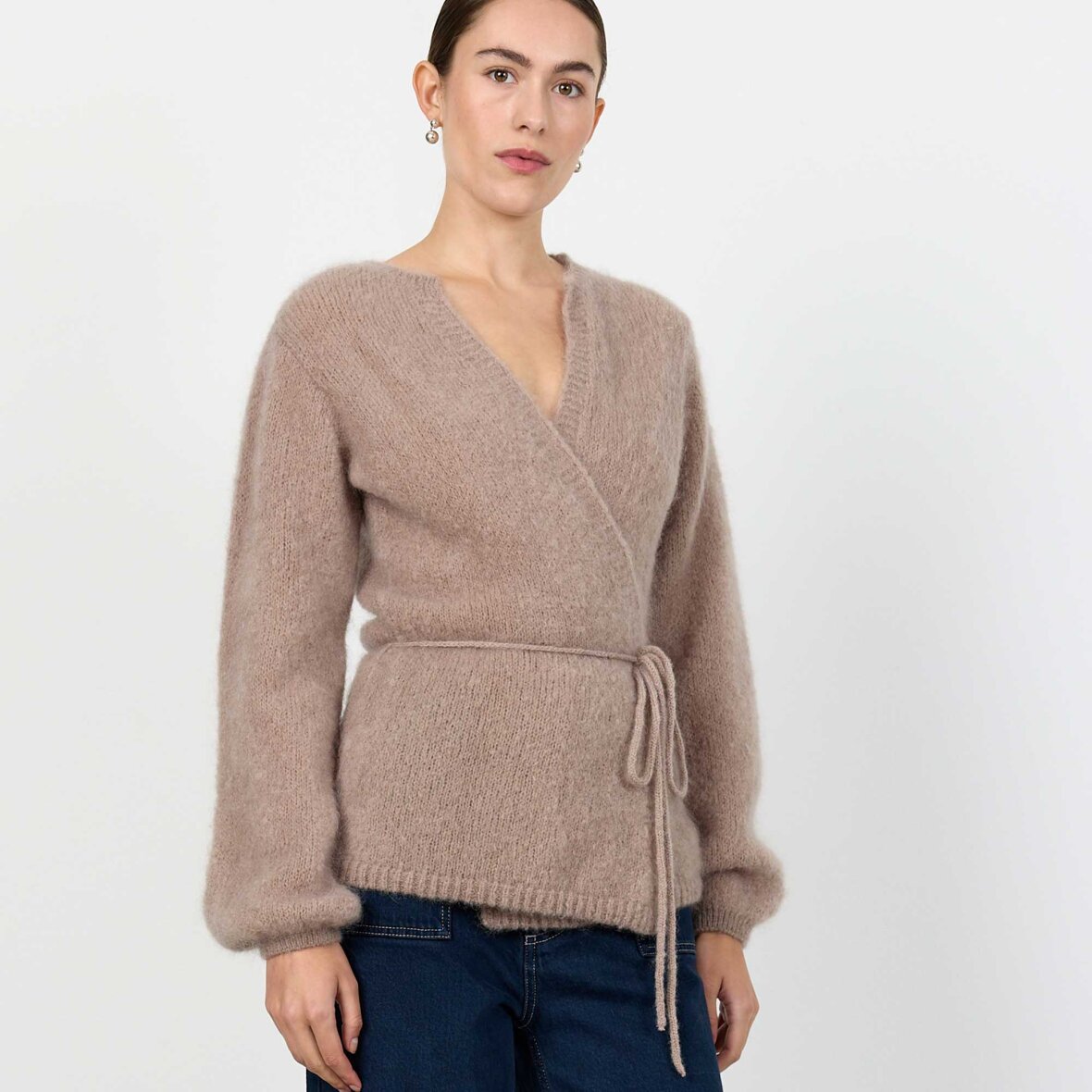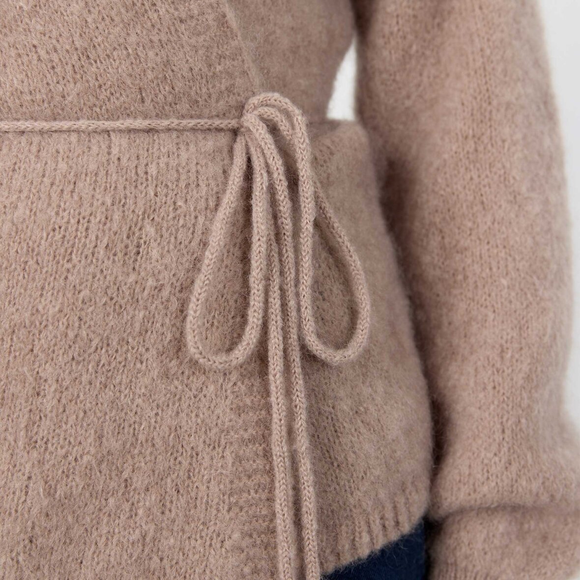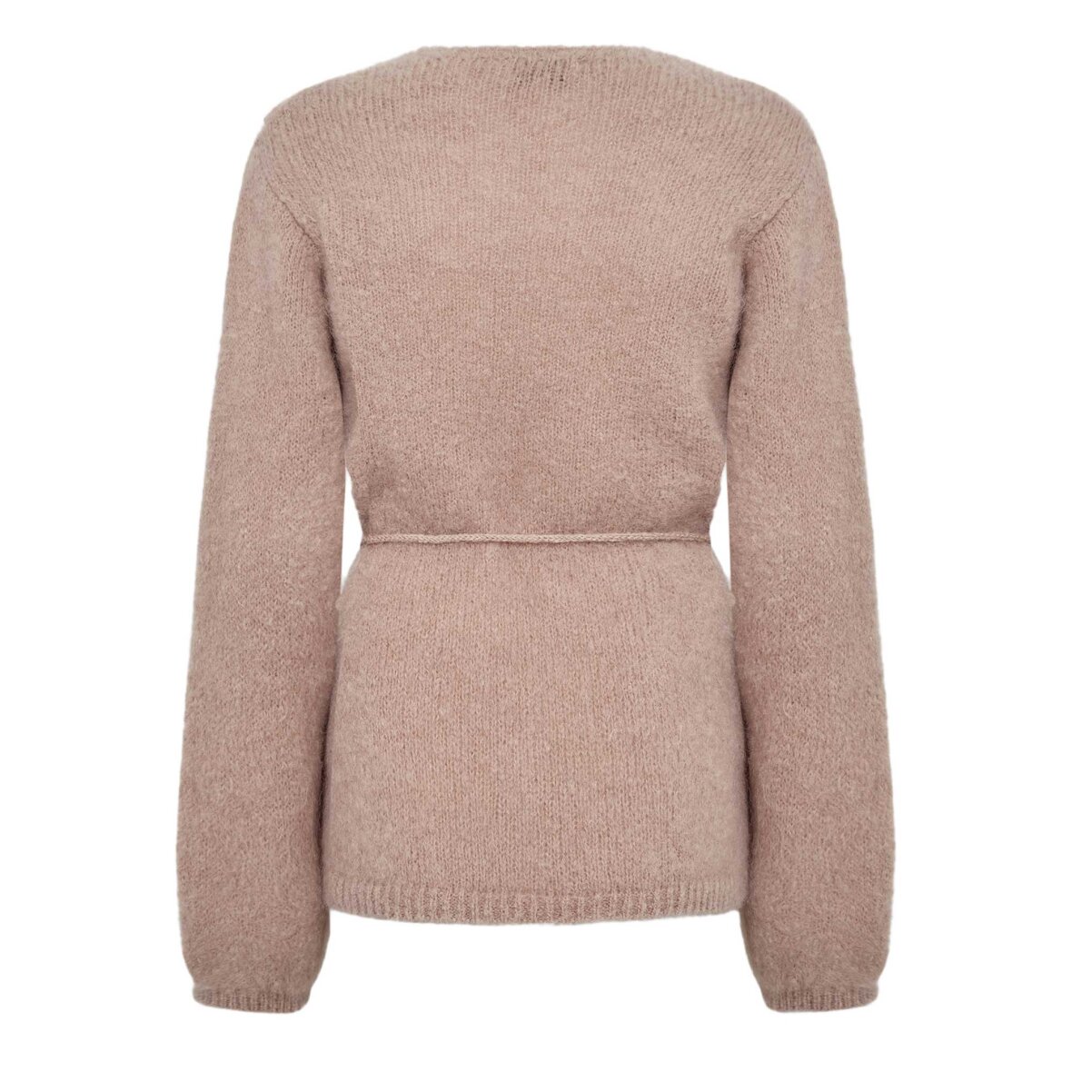 NOREEN 7 er en elegant cardigan med klassisk V-hals, bindebånd i taljen og lange ærmer med blød tekstur. Perfekt til et sofistikeret look, især sammen med skræddersyede bukser.