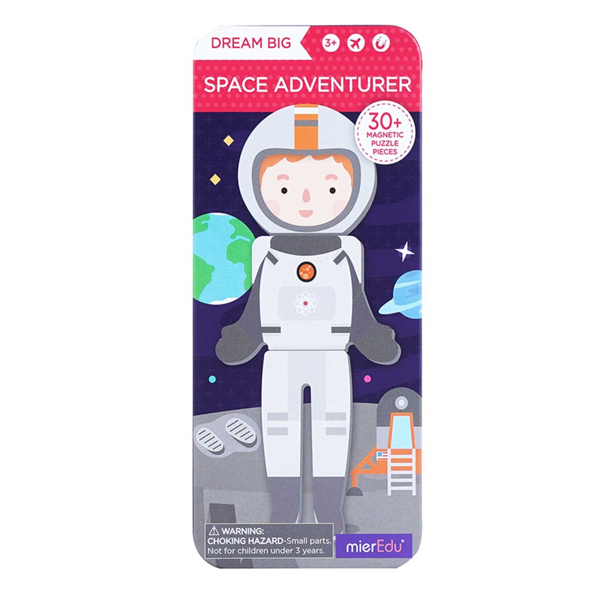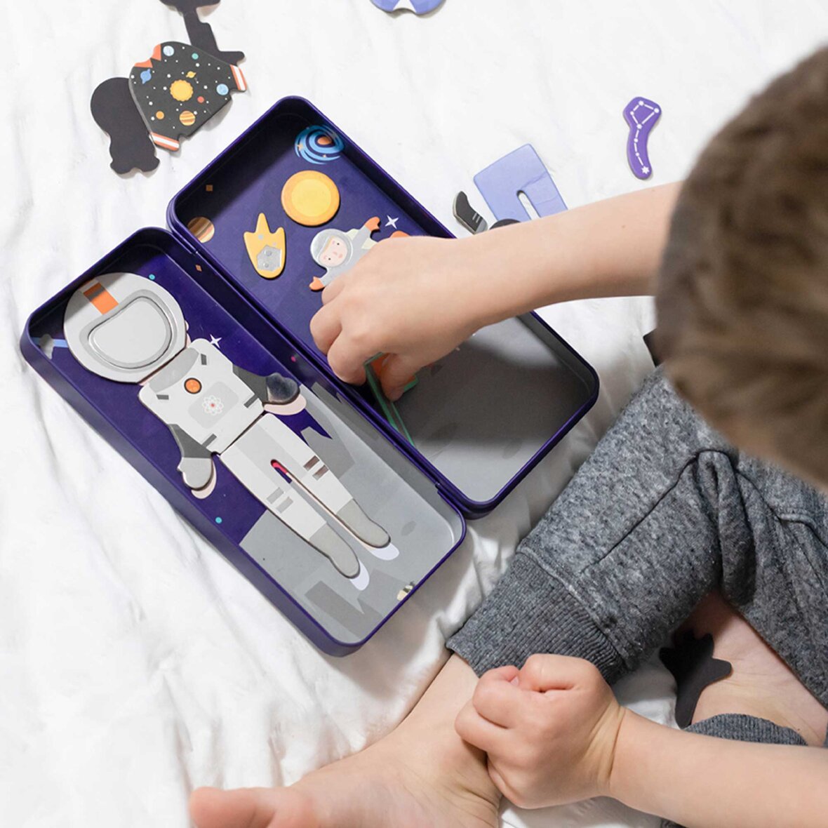 Magnetisk legesæt med astronaut-tema, der giver børn mulighed for at skabe deres egne figurer og fantasifulde historier. Sættet indeholder to baggrunde og over 30 magnetiske brikker, perfekt til kreativ leg derhjemme eller på farten. Legesættet stimulerer fantasi, koncentration, hånd-øje-koordination og finmotorik.