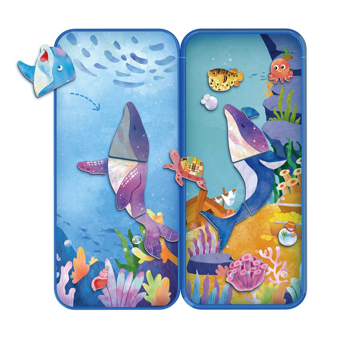 Magnetisk legesæt med hav-tema, hvor børn kan sammensætte deres egne figurer og finde på sjove historier. Sættet indeholder to baggrunde og over 30 magnetiske brikker – perfekt til leg hjemme eller på farten. Legesættet fremmer fantasi, koncentration, hånd-øje-koordination og finmotorik.