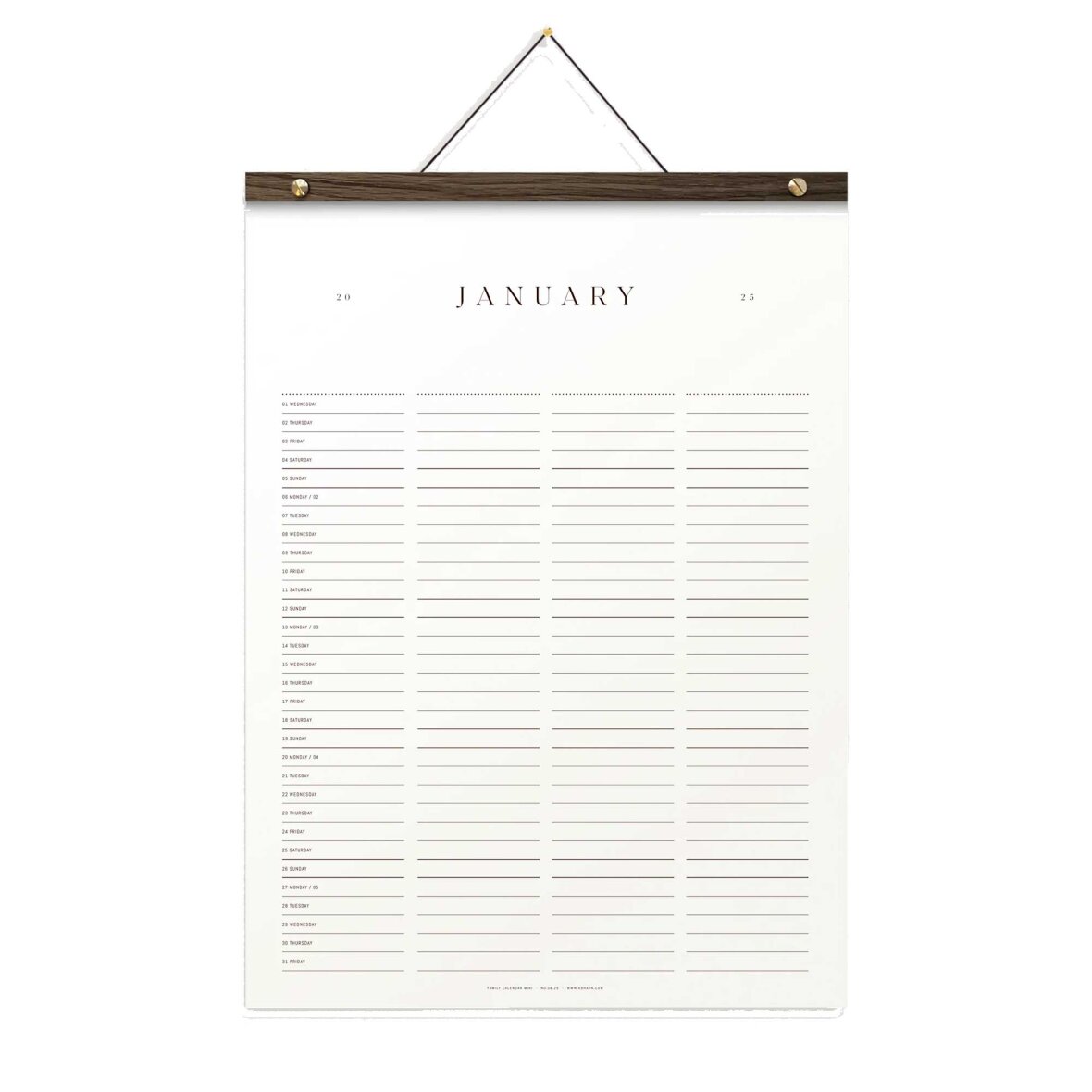 Kalenderen har 12 sider, én for hver måned, og 4 kolonner, så der er plads til hele familiens planer. Vælg mellem en ramme i eg eller røget eg, og nyd de smukke detaljer med lædersnor og messingskruer, som fuldender det stilrene udtryk.
