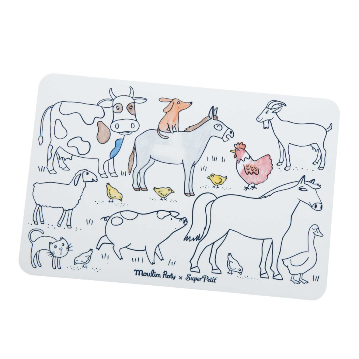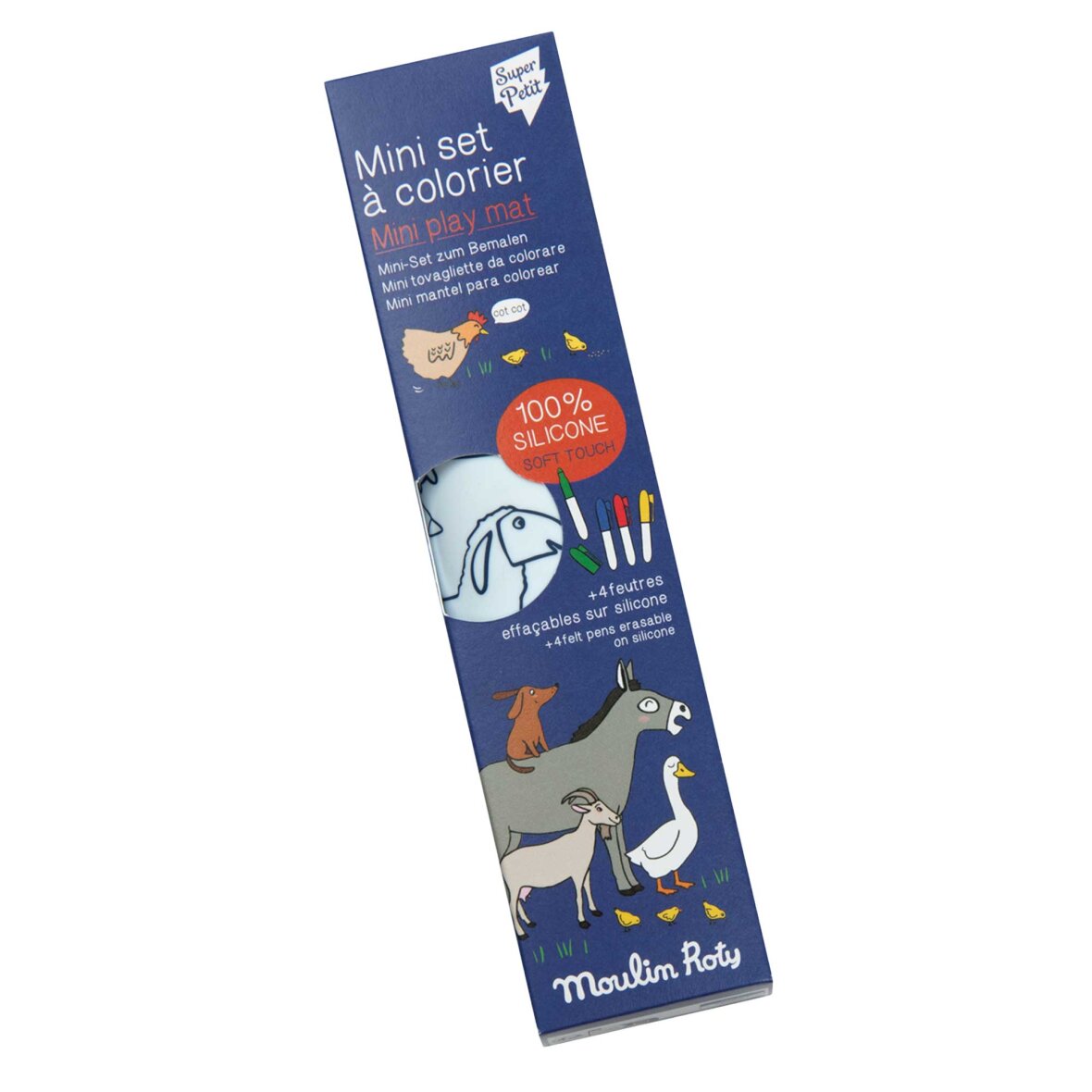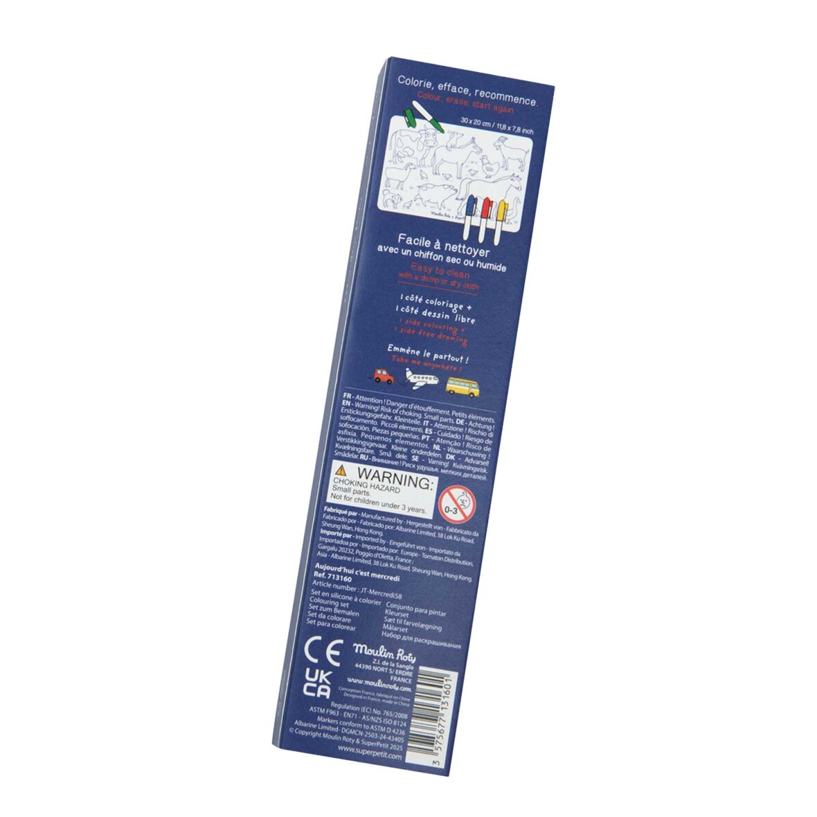 Mini-farvelægningsmåtte Aujourd'hui C'est Mercredi gør kreativ leg sjov og nem! Farvelæg illustrationen på den ene side, brug den tomme side til egne tegninger, tør af og start forfra. Kompakt, praktisk og leveres med fire udviskelige tuschpenne – perfekt til gentagen kreativ leg.