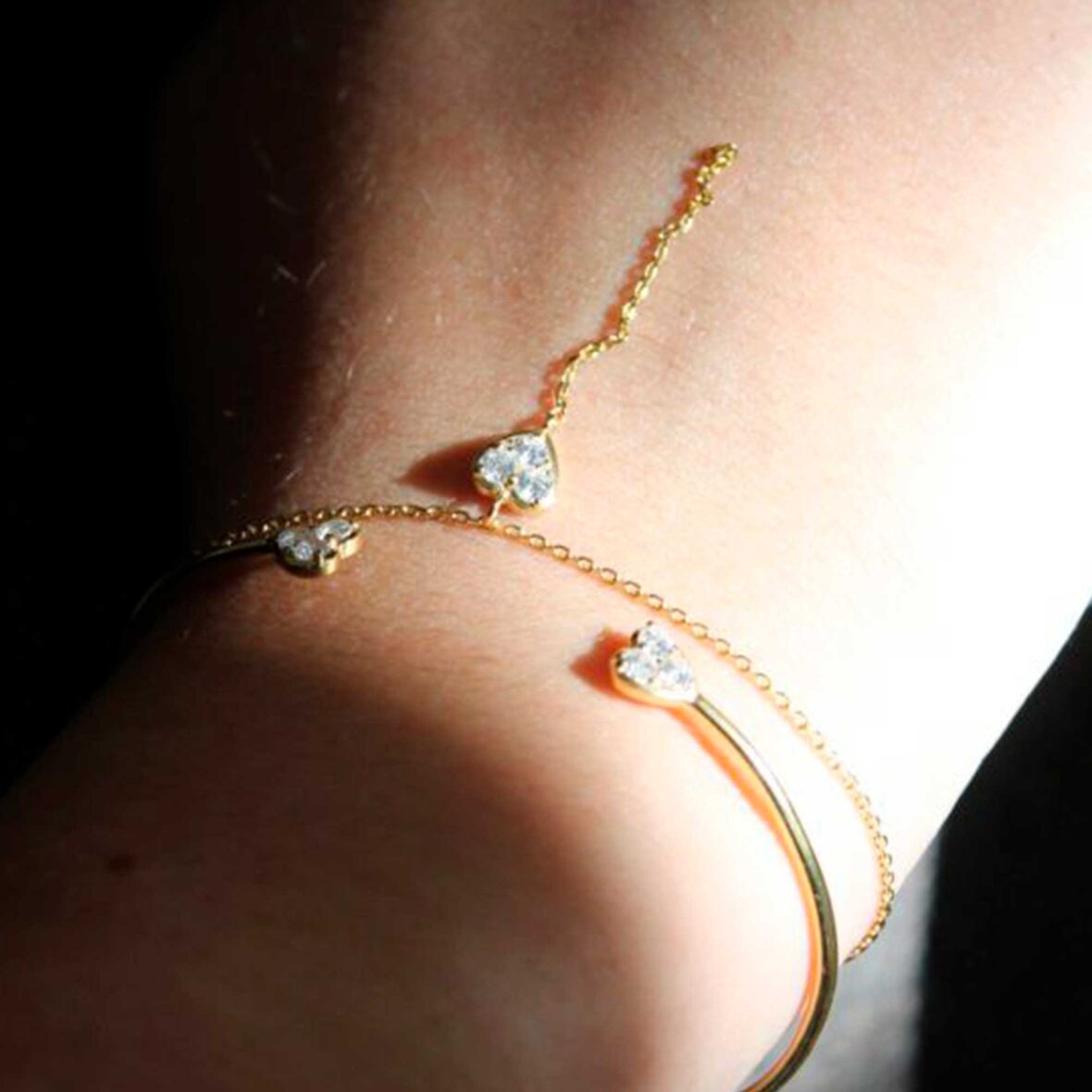 Tilføj et eksklusivt og romantisk touch til din smykkesamling med dette elegante bangle-armbånd fra STINE A Jewelry. Armbåndet i forgyldt sterlingsølv har ved åbningen to små hjerter, hver pyntet med tre funklende zirkoner, som giver en sofistikeret og iøjenfaldende detalje. Bær det alene som et klassisk statement, eller mix det med andre armbånd for et legende stacked-look – perfekt til både hverdag og særlige lejligheder.