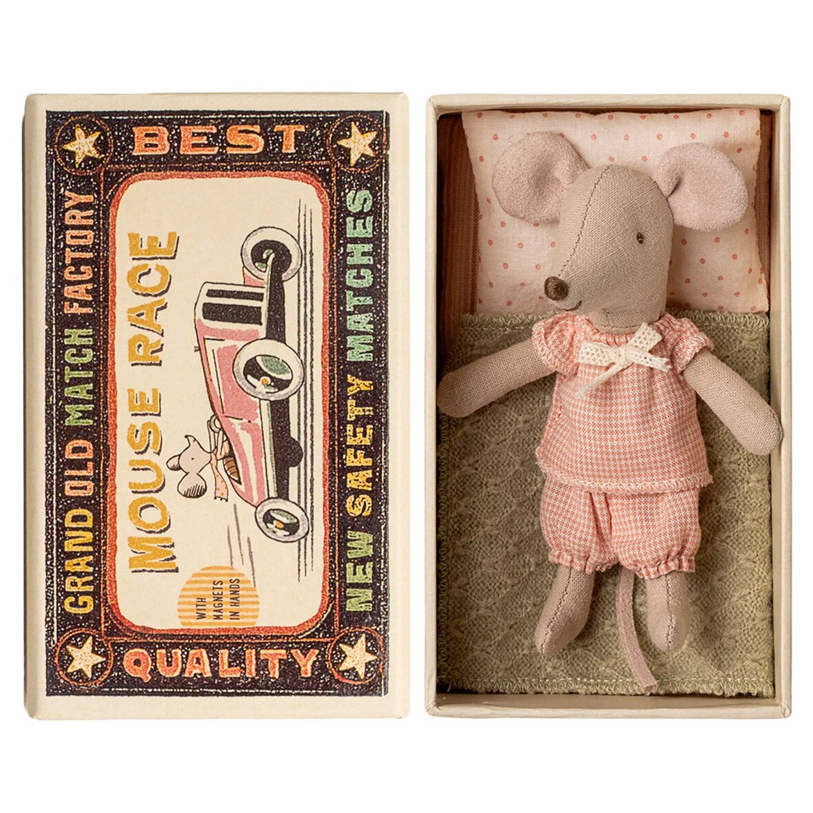 Maileg lillesøster mus i tændstikæske er en sød og lille figur, der passer perfekt til Mailegs miniatureunivers. Den fine detalje og charmerende udtryk gør hende ideel til smålege og fantasifulde eventyr. En hyggelig og krammevenlig tilføjelse til samlingen.