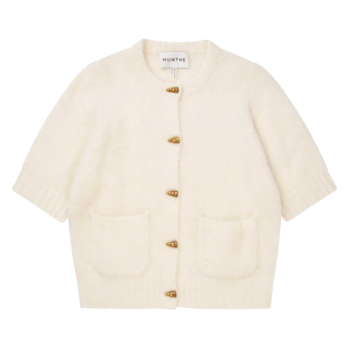 Cardigan med korte ærmer, imiterede hornknapper og to lommer foran. Den er designet med en blød, børstet overflade med et eksklusivt udtryk og høj andel af alpaca, som giver både varme og lethed.