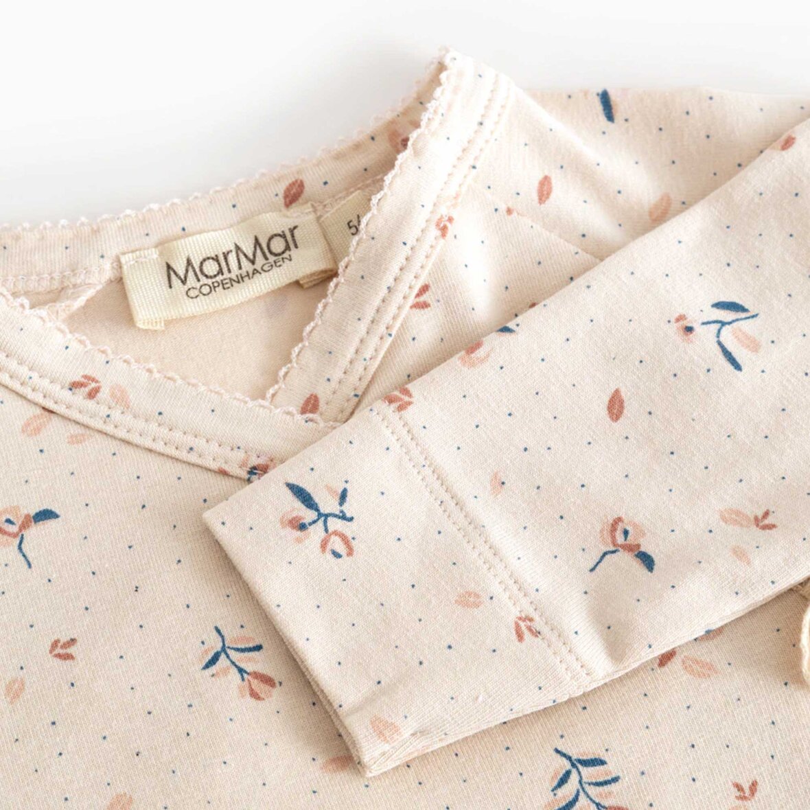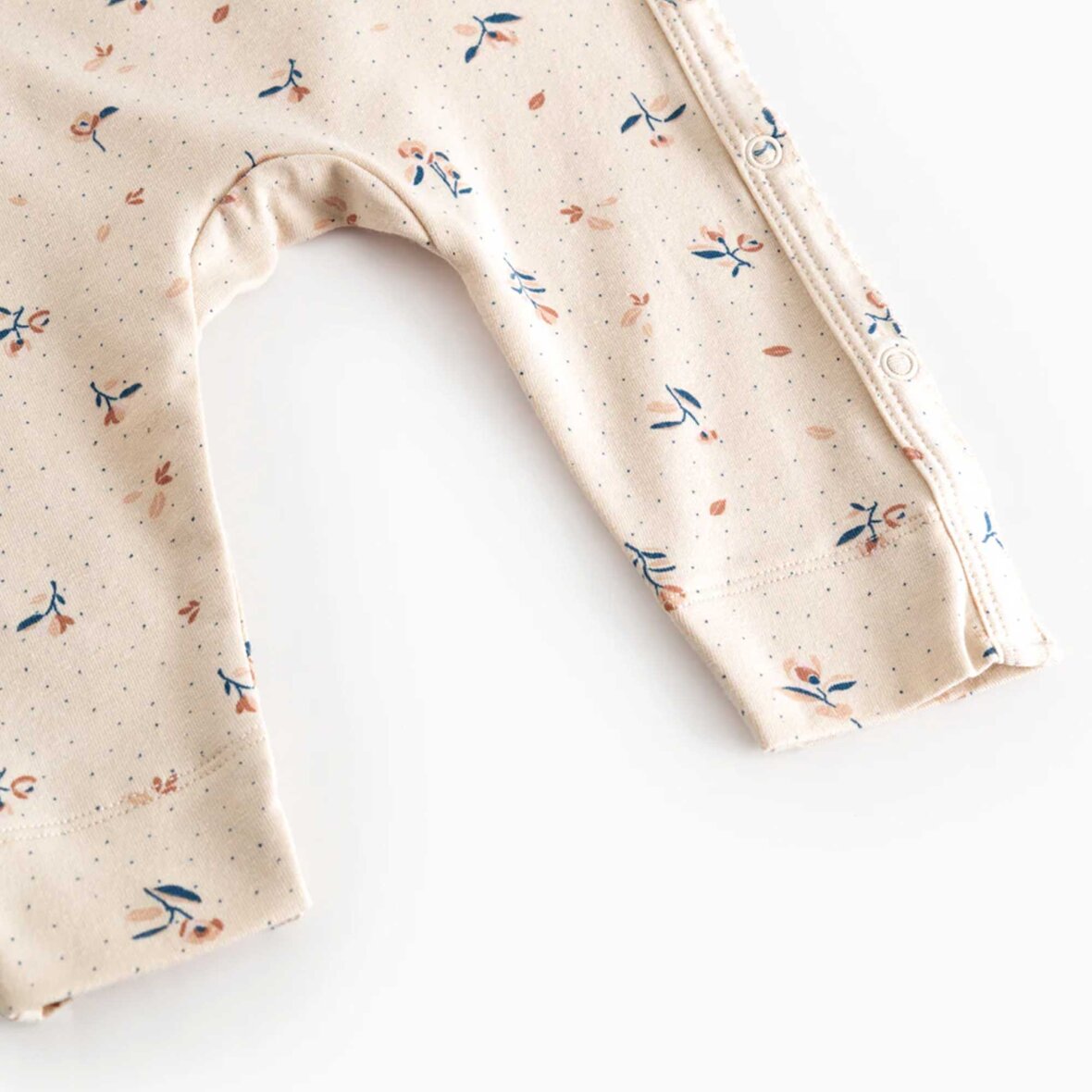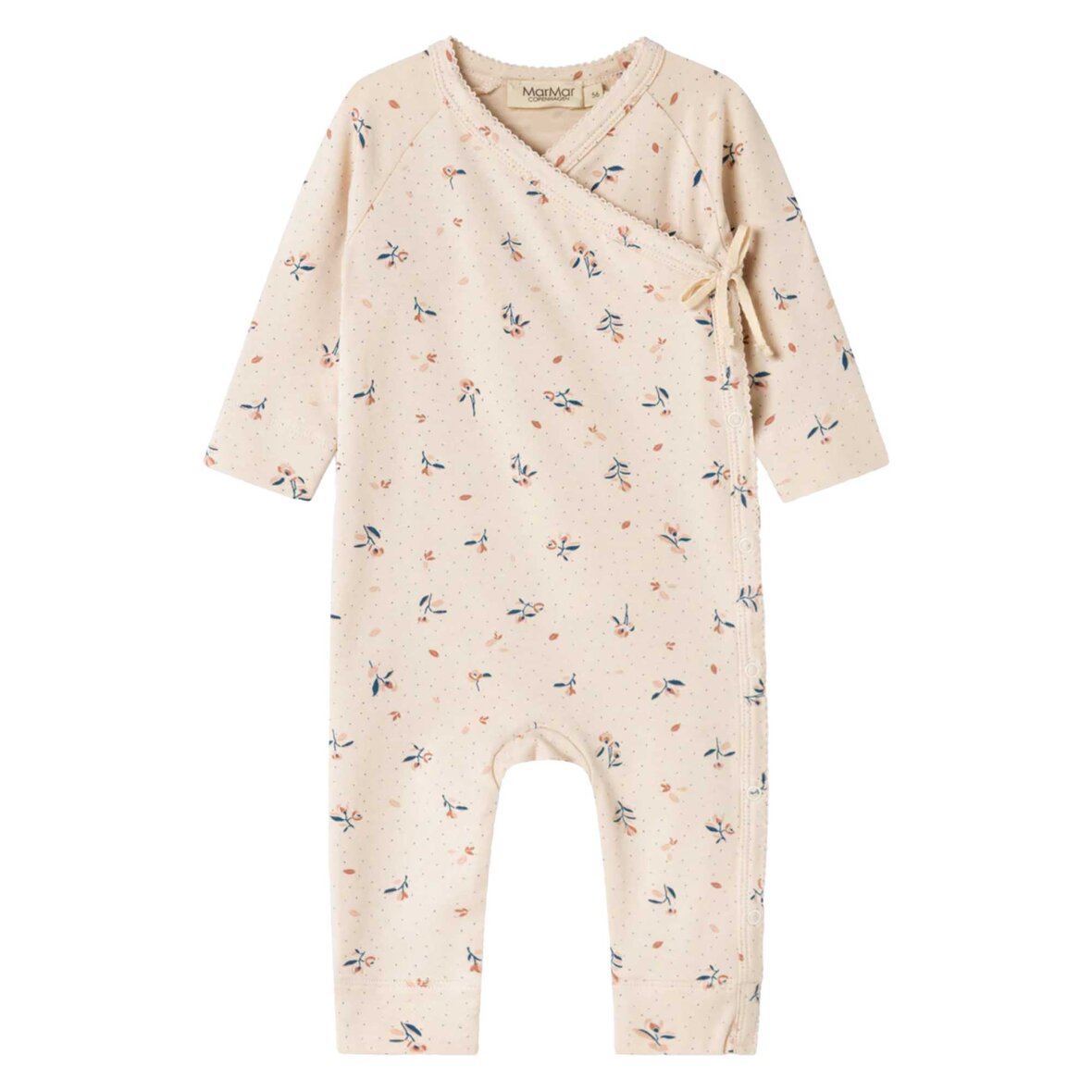 Langærmet heldragt til nyfødte med slå-om-lukning, bindebånd og fint print. Heldragten har dekorative picotkanter og lukkes med trykknapper fra halsen og ned langs det ene ben. Den er både blød, strækbar og behagelig at have på.