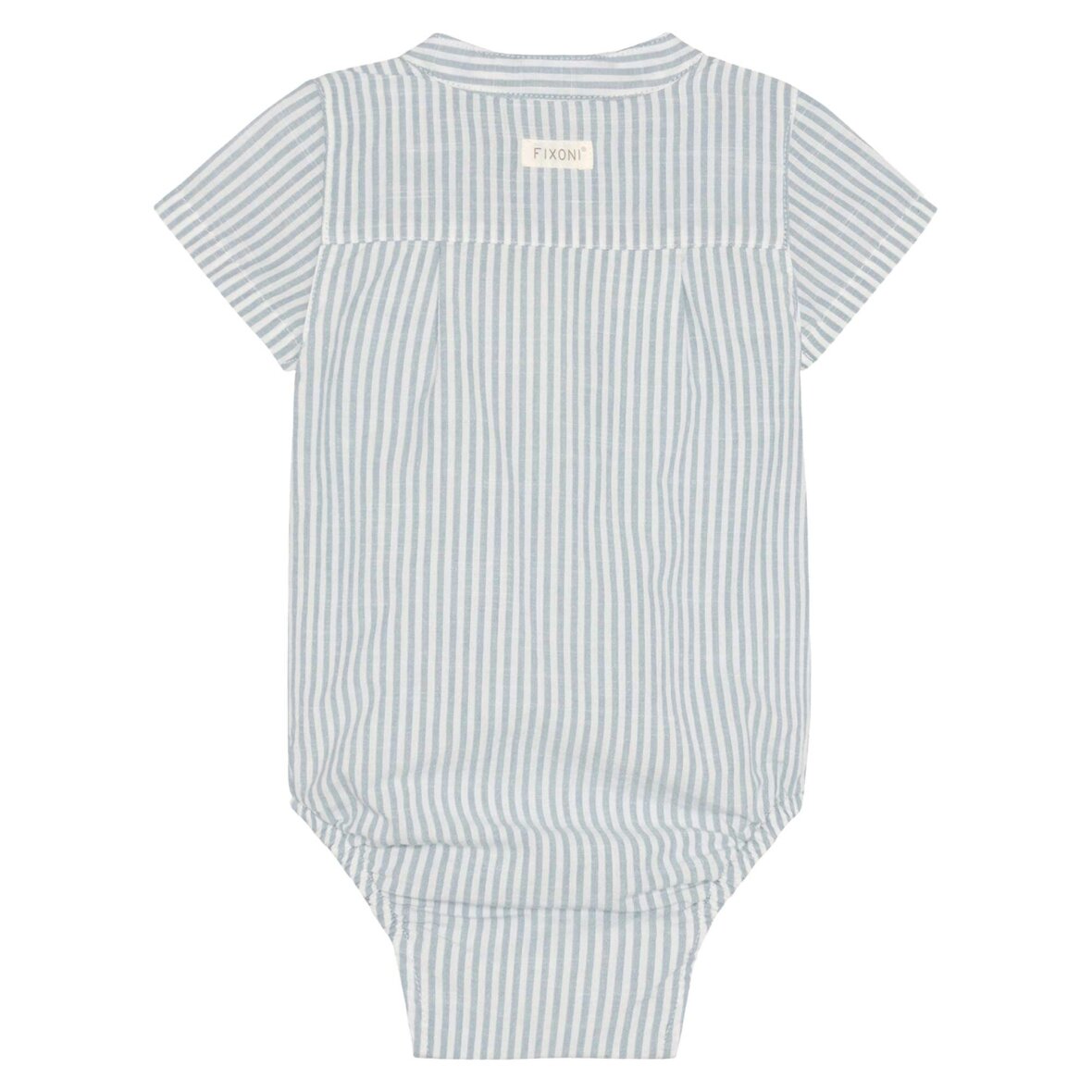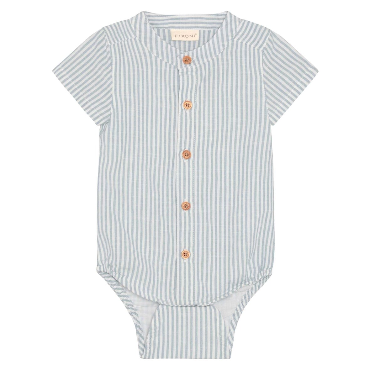 Smart skjortebody fra FIXONI med allover-striber i en behagelig kvalitet. Bodyen lukkes med knapper foran og har praktiske trykknapper mellem benene, som gør den nem i hverdagen. Elastik ved benene sikrer en god pasform og komfort hele dagen.