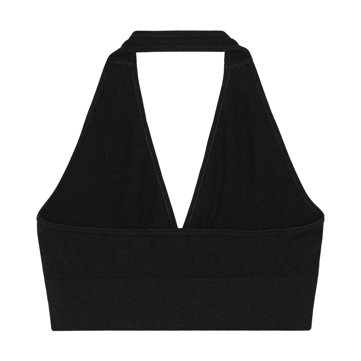 Sort sportsbh med halterneck-udskæring, designet til komfort og bevægelsesfrihed. Overdelen har en stretchy pasform og elastiske sømme, der sikrer støtte og komfort under træning.