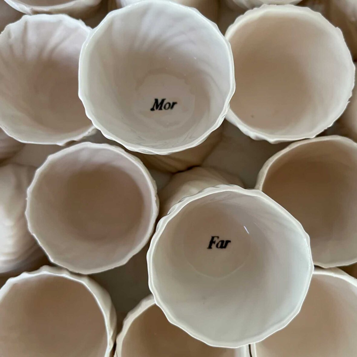 Denne kop er påtrykt teksten “far” indeni. Koppen er håndlavet i Aarhus i det fineste hvide porcelænsler. Den tåler opvaskemaskine og har en størrelse, der passer perfekt ind i din kop-reol.