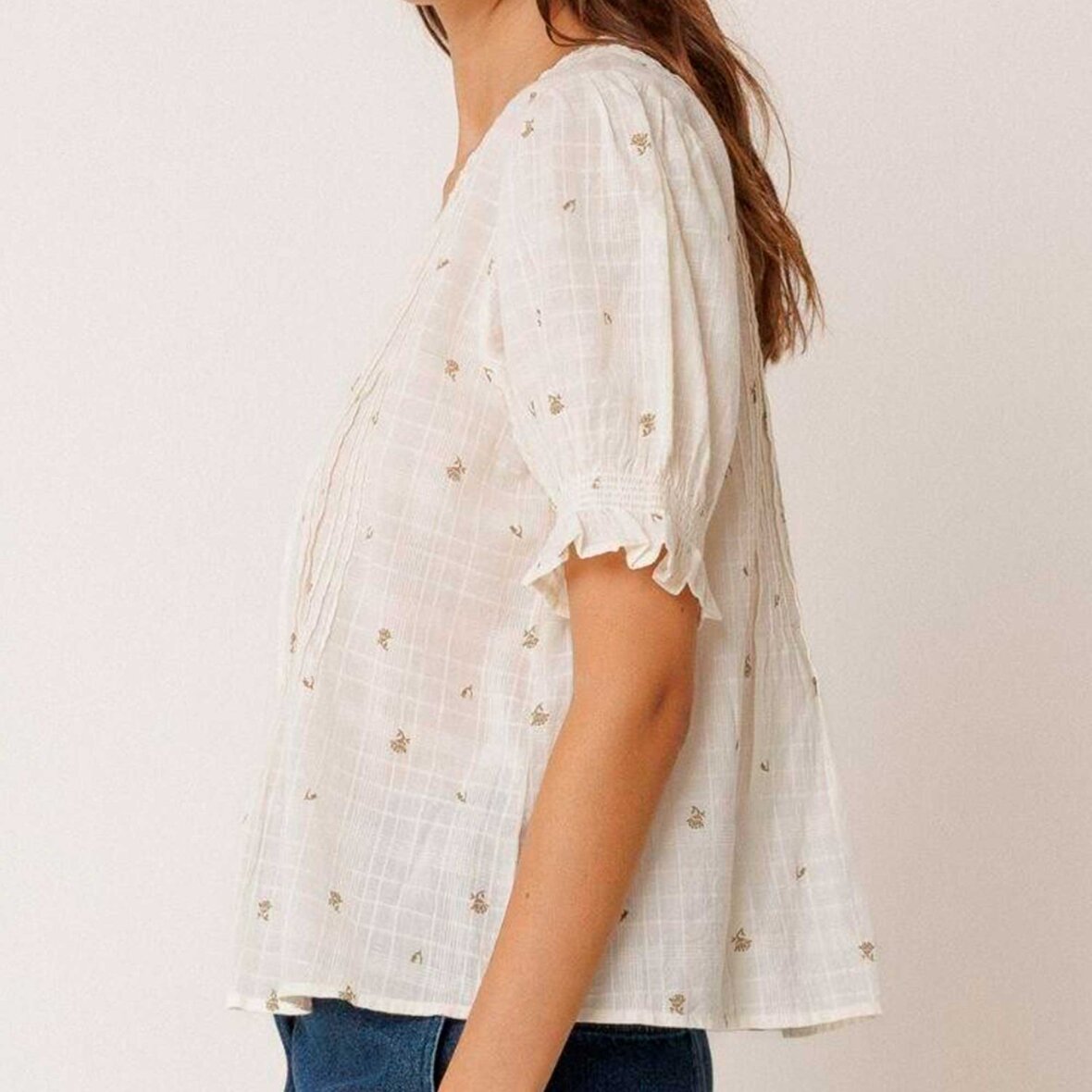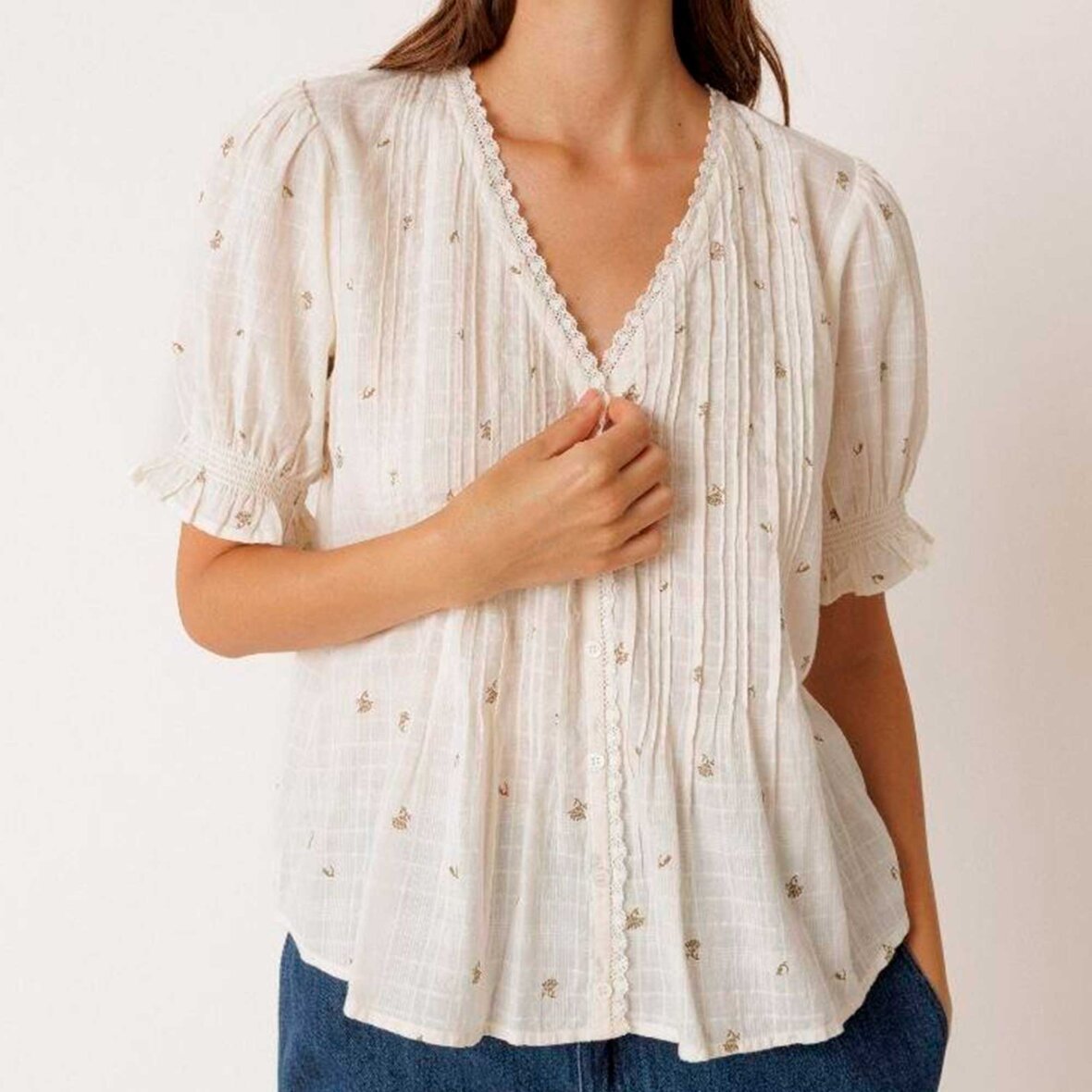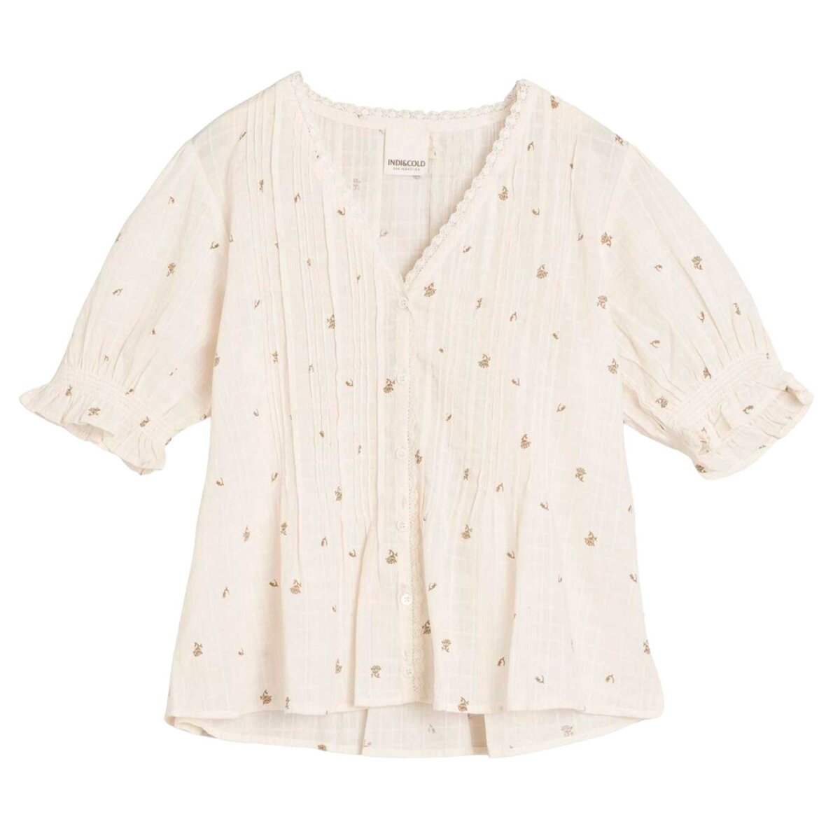 Fin skjorte fra Indi & Cold med diskret mønster, blød bomuld med vævet struktur og blonde detaljer. Skjorten har v-hals og lukkes med små lyse knapper, samt syninger på begge sider af åbningen for en let facon. Ærmerne er korte til albuerne med elastiksyninger, hvilket giver komfort og et feminint look.