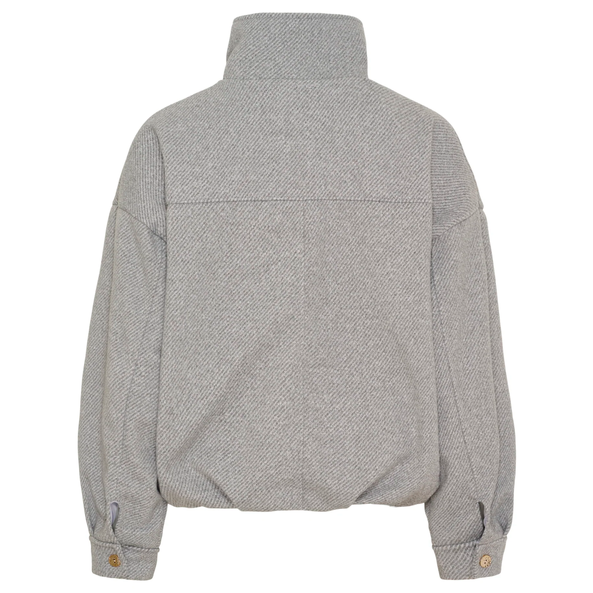 Moderne og cool jakke i klassisk grå med blød, struktureret overflade. Modellen har høj krave, kort længde, lynlåslukning foran og store brystlommer. Elastik forneden skaber et afslappet og stilrent look, hvilket gør jakken ideel som overgangsjakke.