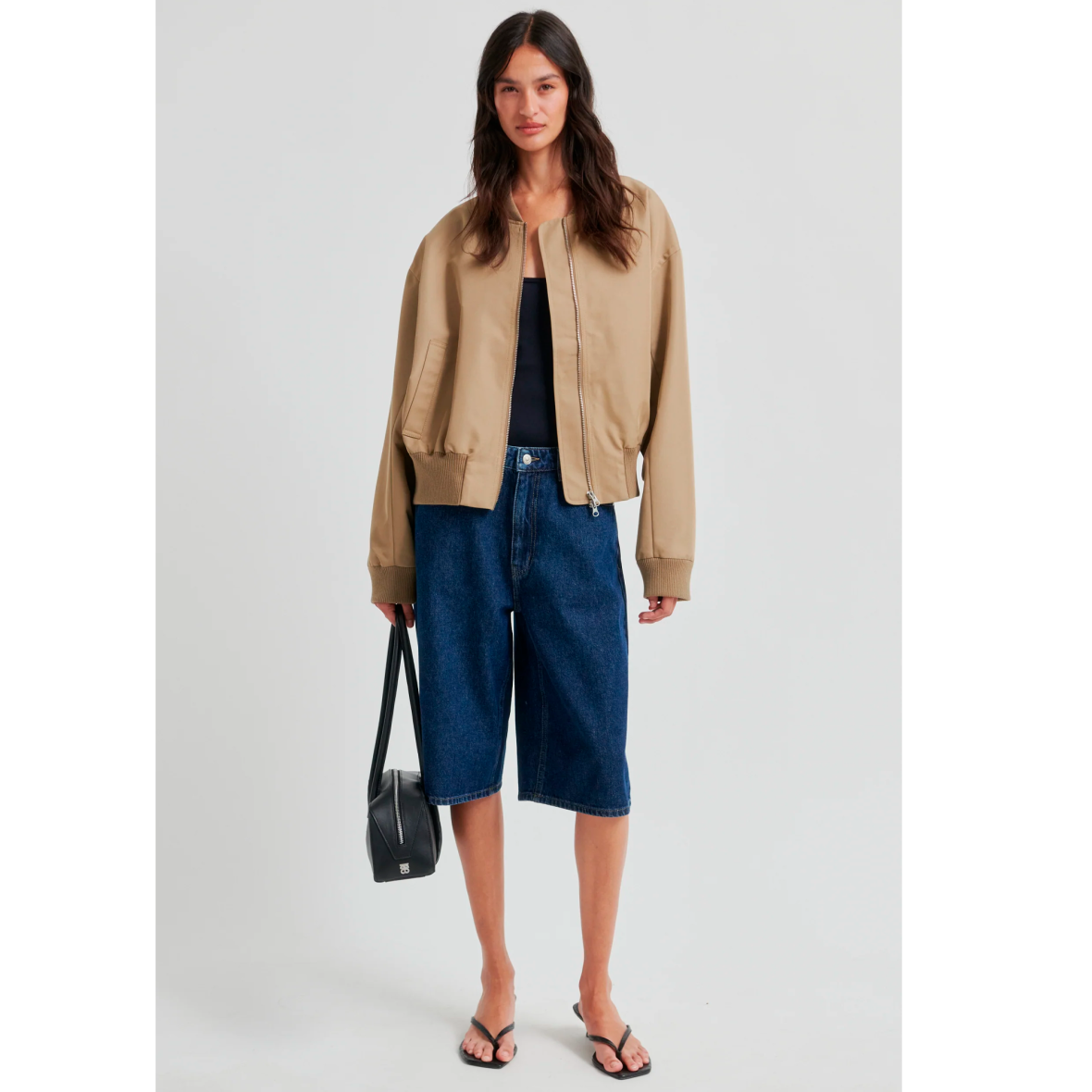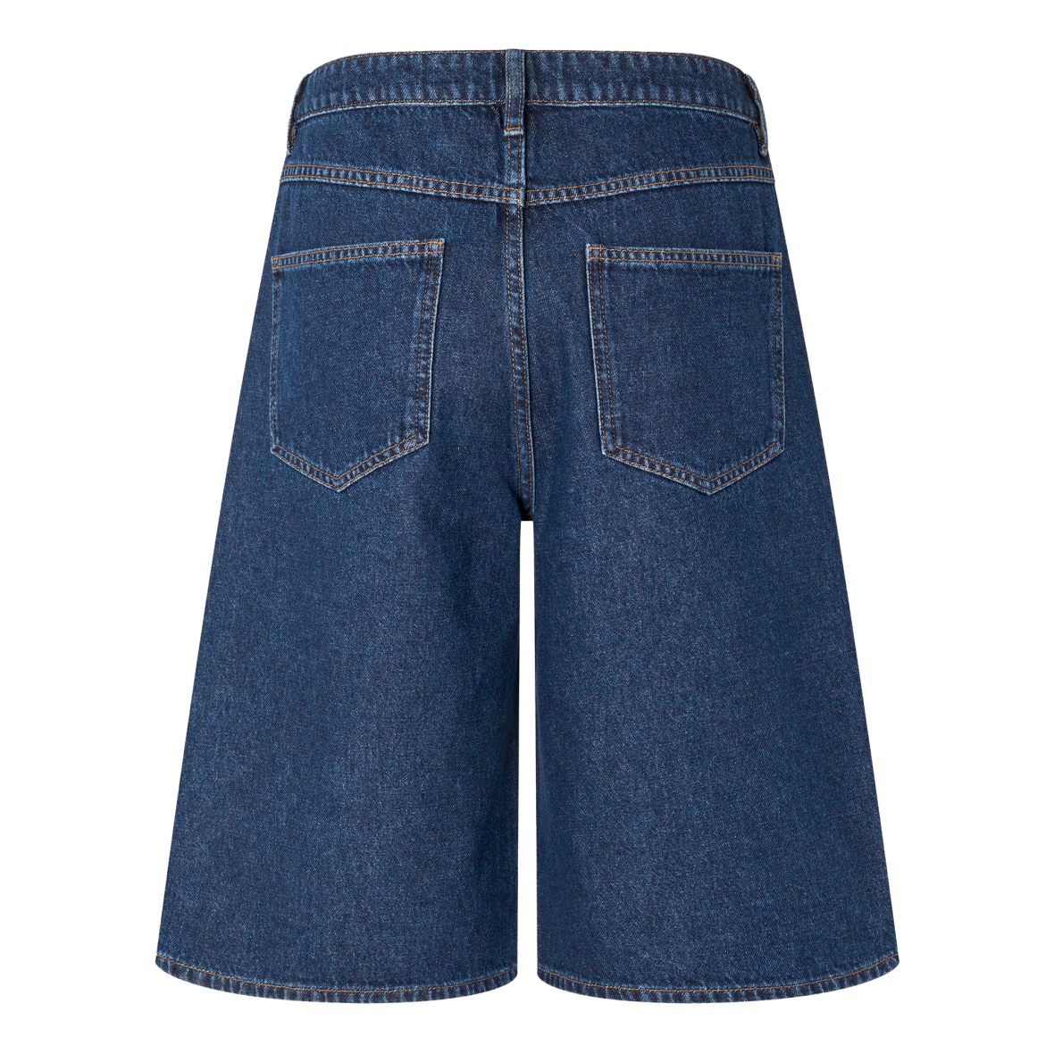 Denimshorts i mørkeblå med et afslappet og moderne udtryk. Modellen har løs pasform og lige, brede ben. Shortsene er knælange og har et oversized look. Designet fuldendes med klassiske kontraststikninger og lommedetaljer.