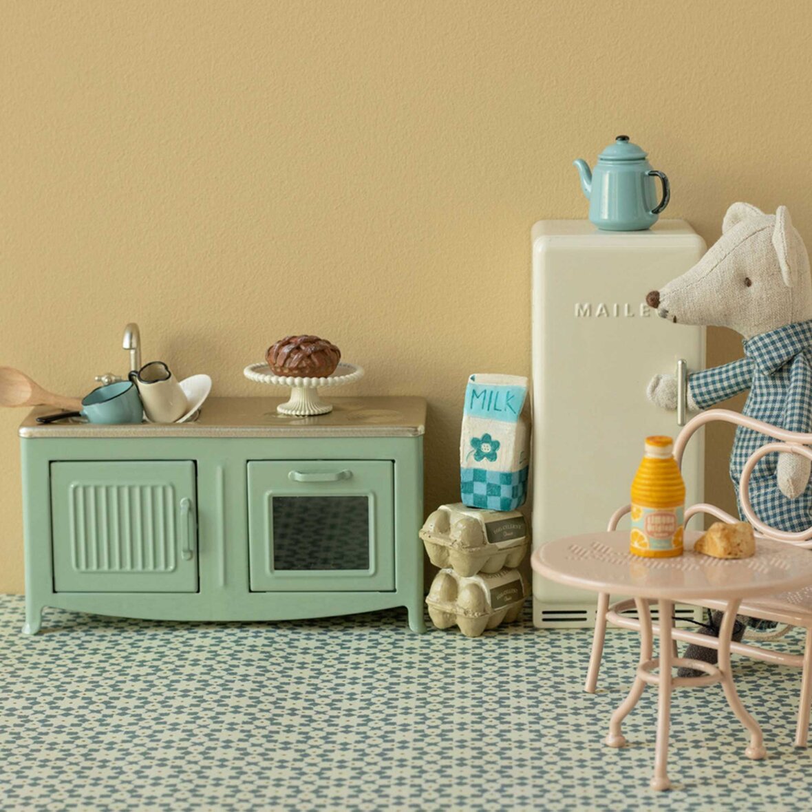 Køkkenet er hjertet i ethvert hjem – også i museuniverset. Dette fine metalkøkken har en smuk farvetone og er fyldt med charmerende detaljer som skabslåge, vask og en ovn med en nybagt tærte. Designet er gennemtænkt og passer perfekt i størrelsen til musefamilien, så legen hurtigt kan tage form og inspirere til hyggelige hverdagsscenarier.