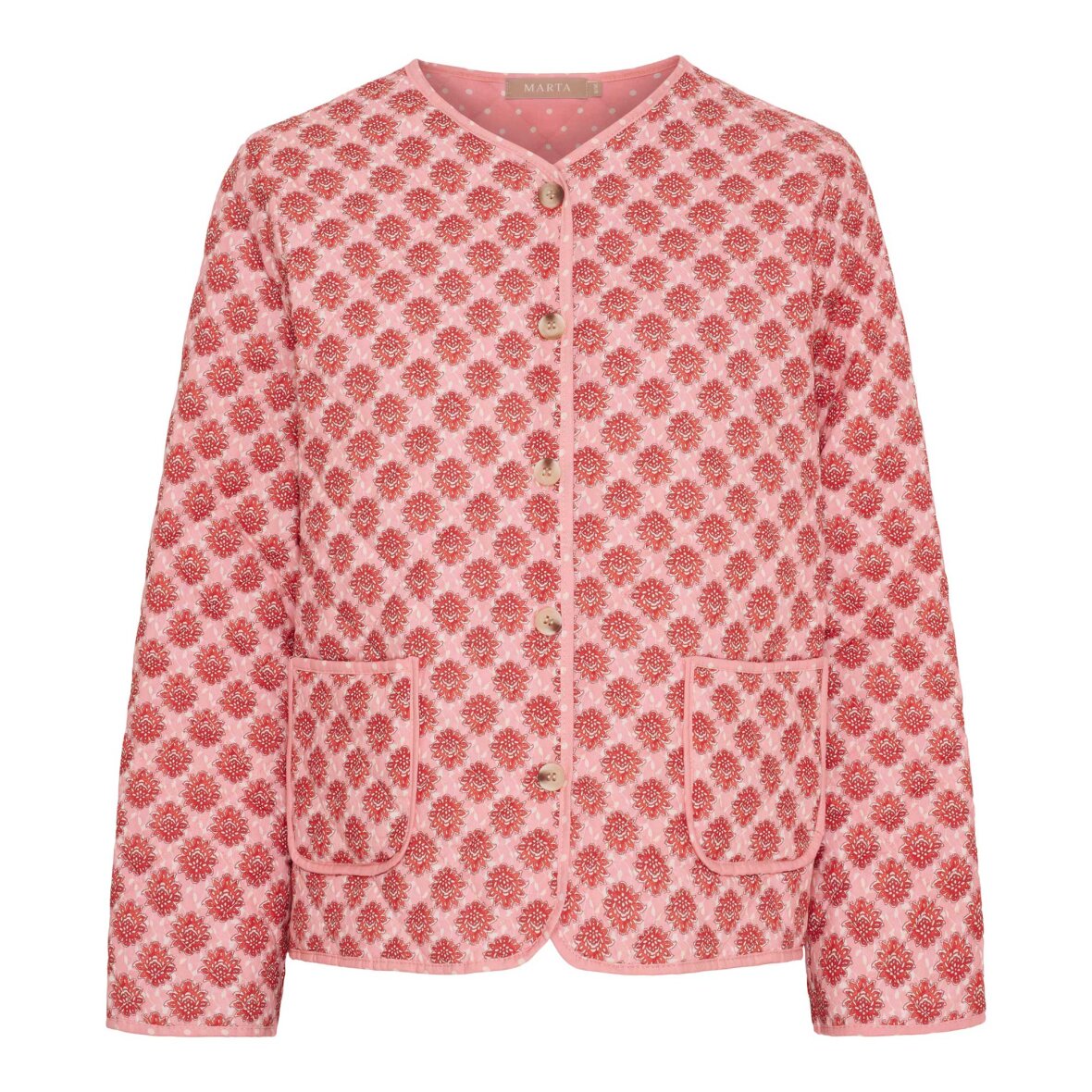 Overgangsjakke fra Marta Du Château med blomsterprint, lommer og knapper foran. Jakken er feminin og alsidig, og kan styles til mange forskellige outfits i garderoben.