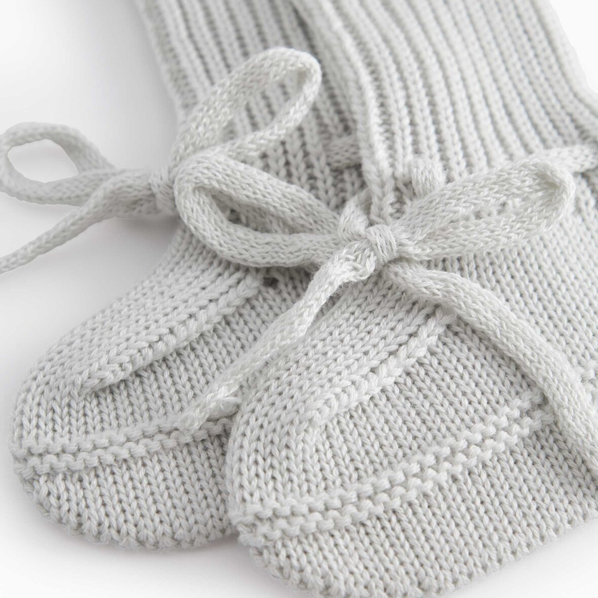 Disse fine strikfutter er designet til at holde små fødder varme og trygge. Den bløde strikkvalitet føles behagelig mod huden, mens det praktiske bindebånd sikrer, at futterne bliver siddende, selv når barnet bevæger sig.
