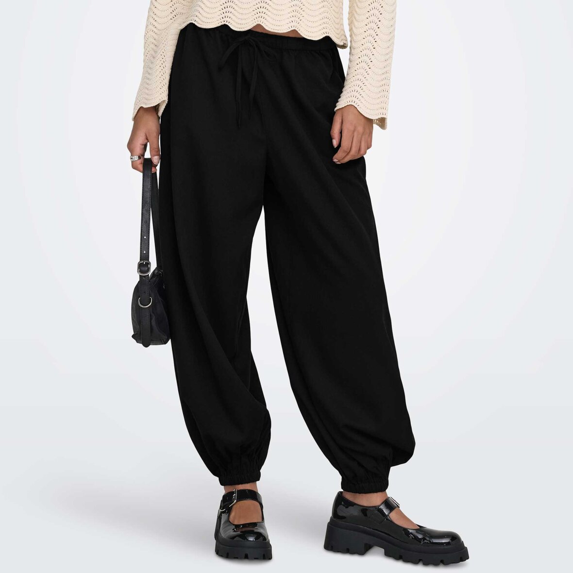 Buksen er et par løstsiddende bukser med et moderne og afslappet udtryk i en helt klassisk sort farve. Bukserne har en bred, komfortabel pasform med elastik i taljen og ved anklen, der gør dem nemme at tage på og behagelige at have på hele dagen. Designet er enkelt og minimalistisk, så bukserne kan styles både med sneakers til hverdagslooks og med mere elegante styles til aftenbrug. Materialet føles let og falder flot langs benene.