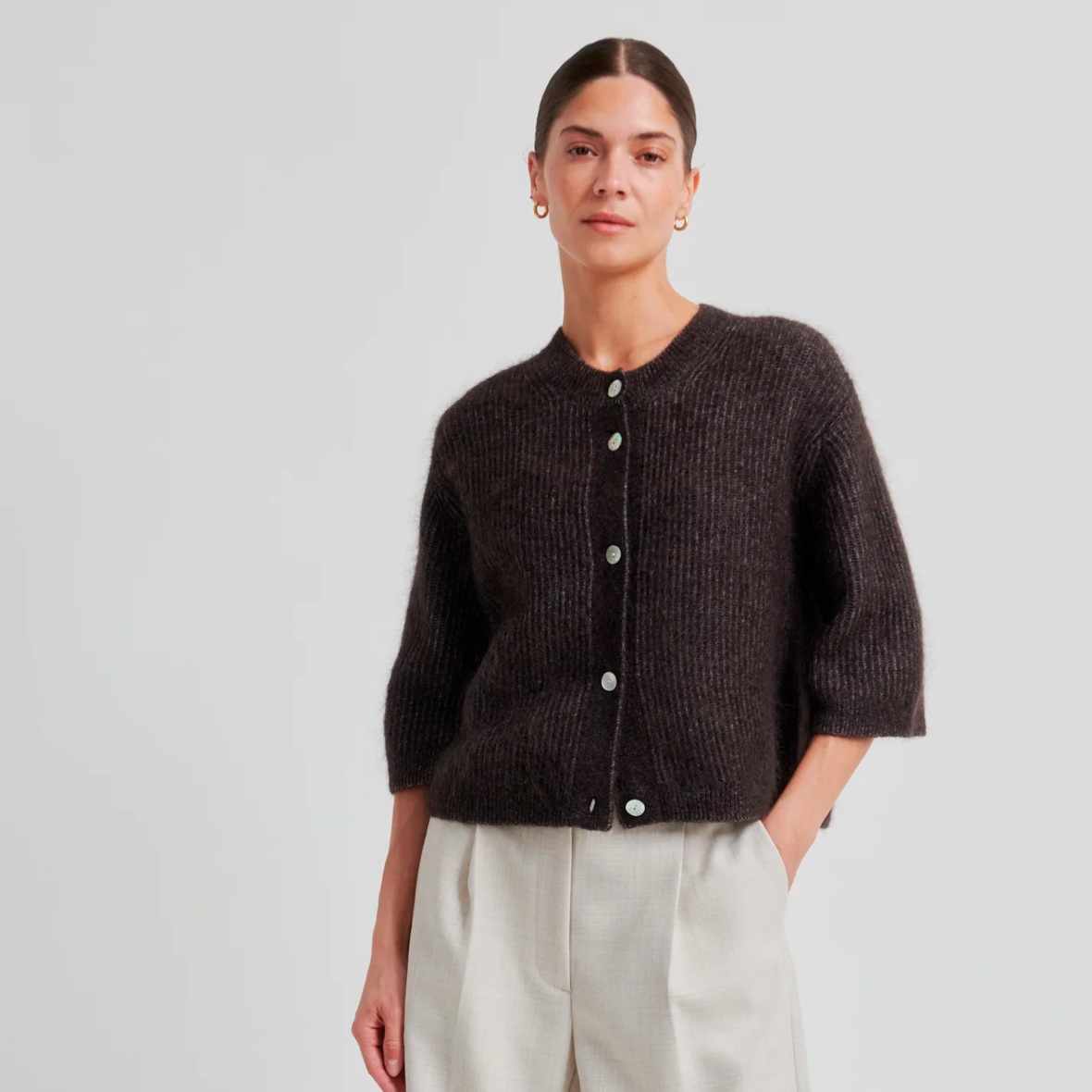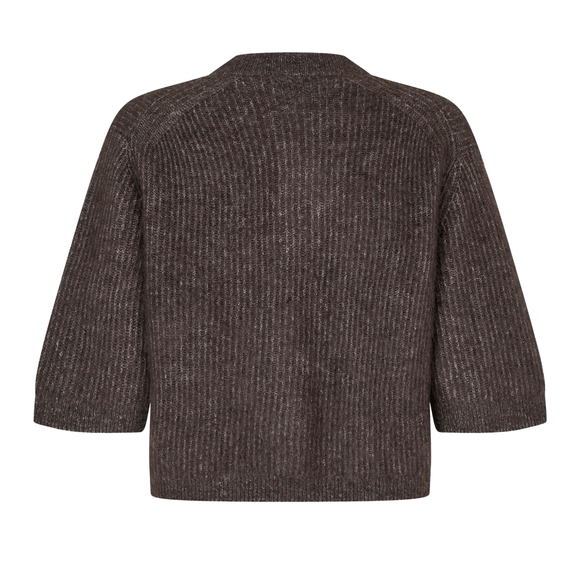Kortærmet cardigan i ribstruktur, fremstillet i en blød mohair-uldblanding. Cardiganen har rund hals, gennemgående perlemorsknapper, lave skuldre og en afslappet, let boxy pasform.