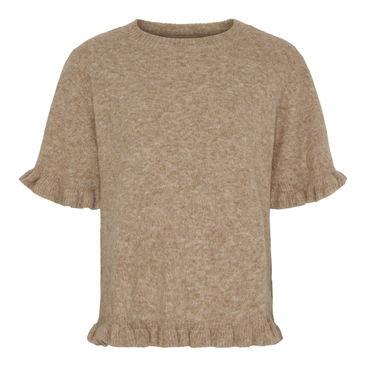 En feminin kortærmet strikbluse med fine flæsedetaljer ved ærmekanterne og i bunden, som giver et elegant og let romantisk udtryk. Den bløde strikkvalitet har en flot struktur, der tilfører ekstra karakter til designet. Modellen har en klassisk silhuet og er nem at style til både jeans, nederdele eller pæne bukser.