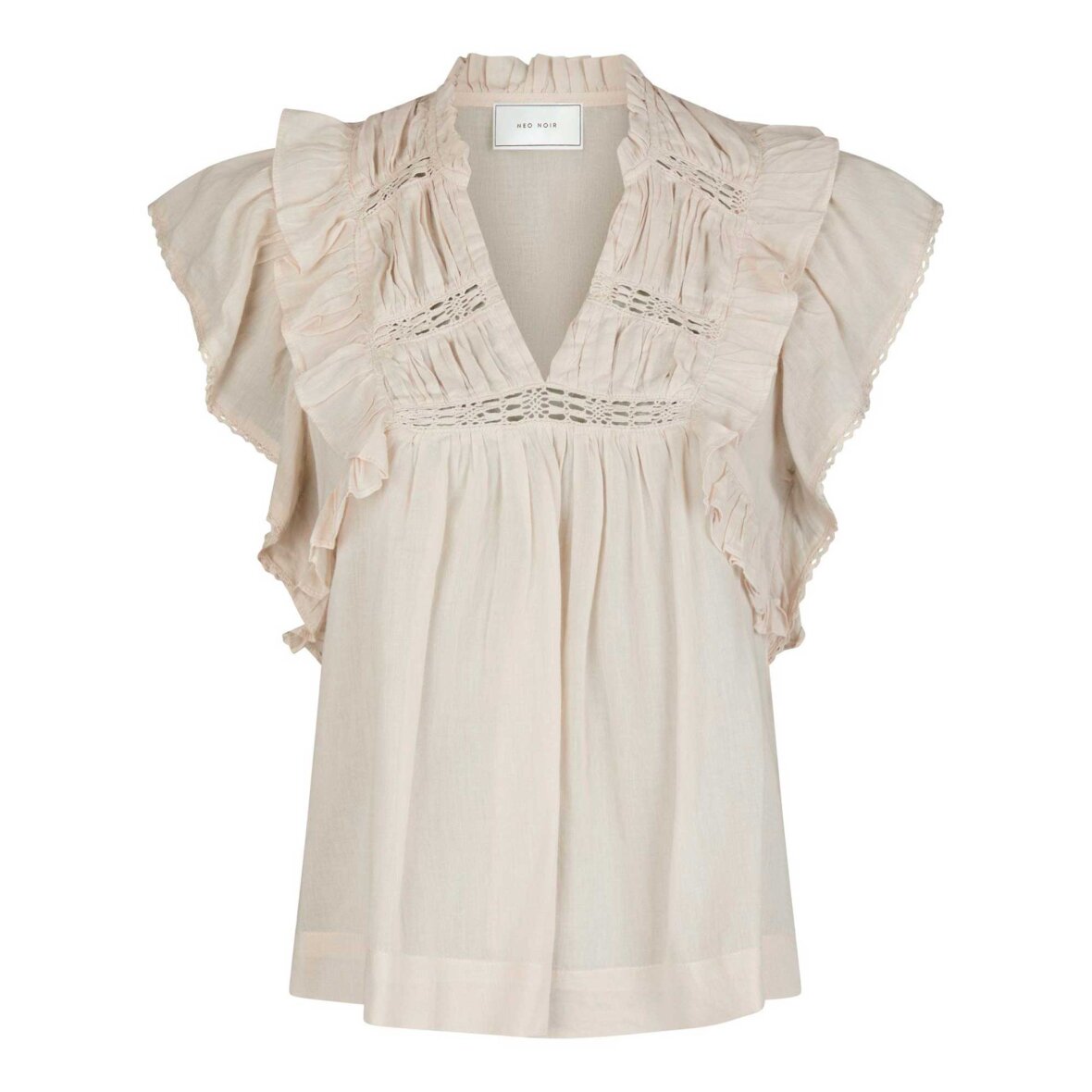 Feminint ærmeløst top med smukke detaljer som bånd og flæser, der giver et let og elegant udtryk. Modellen har en løs og komfortabel pasform, som stadig fremhæver silhuetten på en flatterende måde.