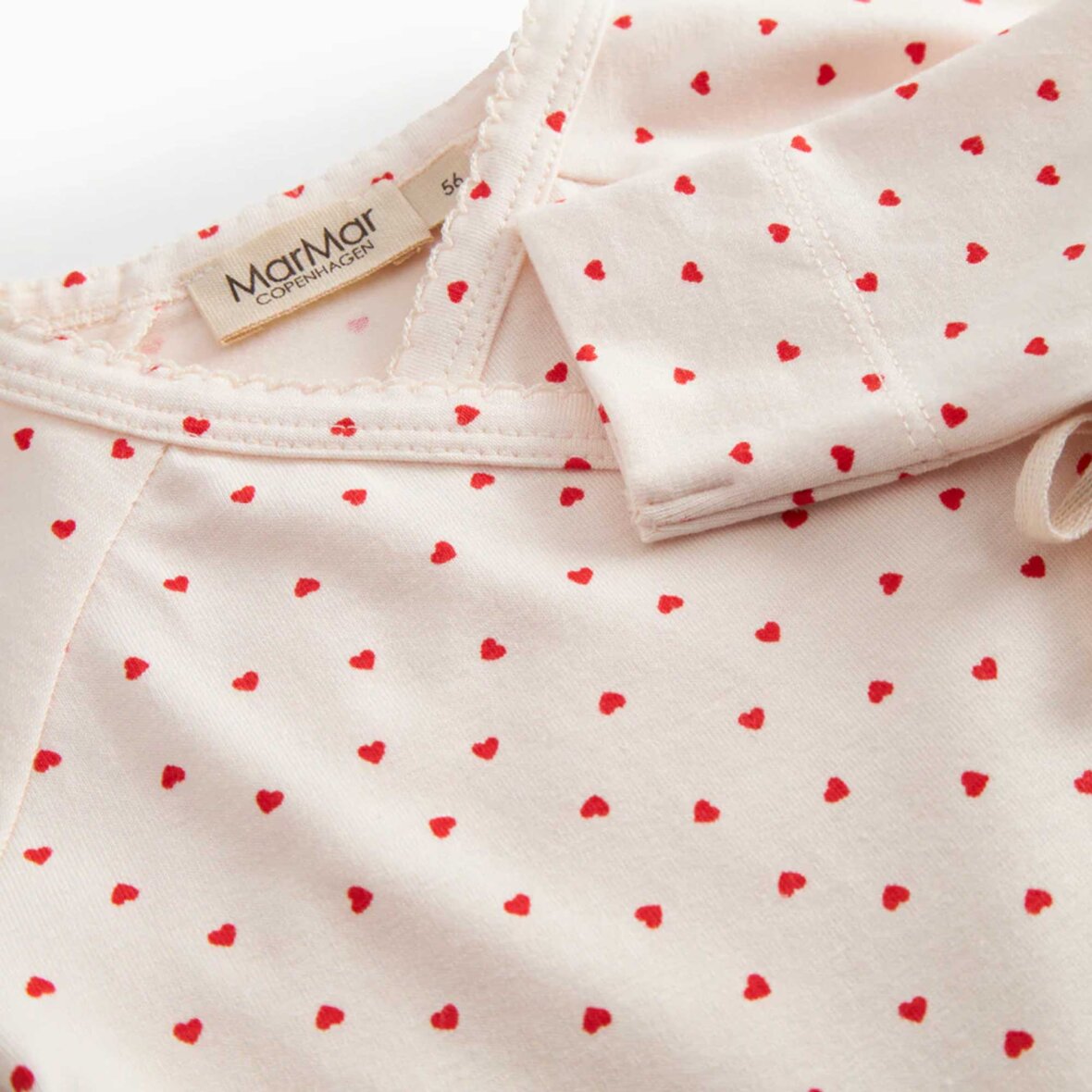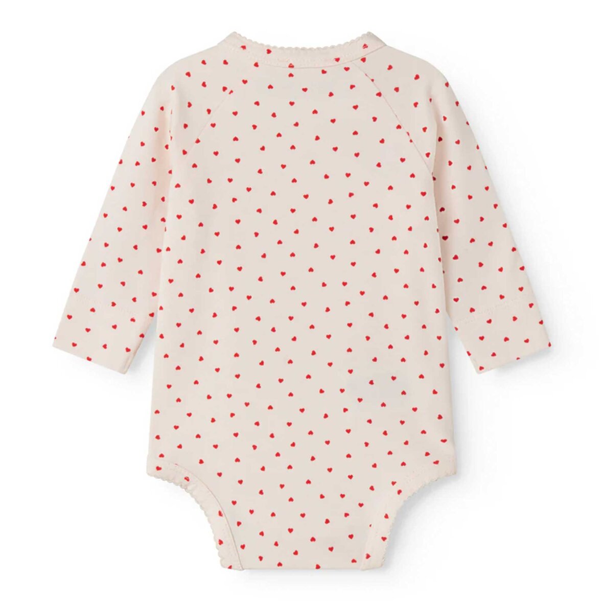 En blød og behagelig bodystocking med slå-om-lukning og sødt hjerteprint. Den lukkes nemt med trykknapper og bindebånd og har fine picotkanter, som giver et sødt og delikat touch. Strækbart materiale sikrer komfort og bevægelsesfrihed for de små.