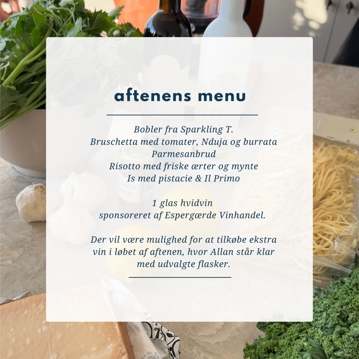 Vi serverer en let og lækker sommermenu, lavet i samarbejde med Morten fra Made by Mama. Denne aften tager han jer med ind i historien bag retterne og forkæler jer med smag og fortællinger. Morten er netop nu aktuel i MasterChef og deler undervejs historier om livet i Italien, hvor passion, kvalitet og kærlighed til de små detaljer er i centrum.