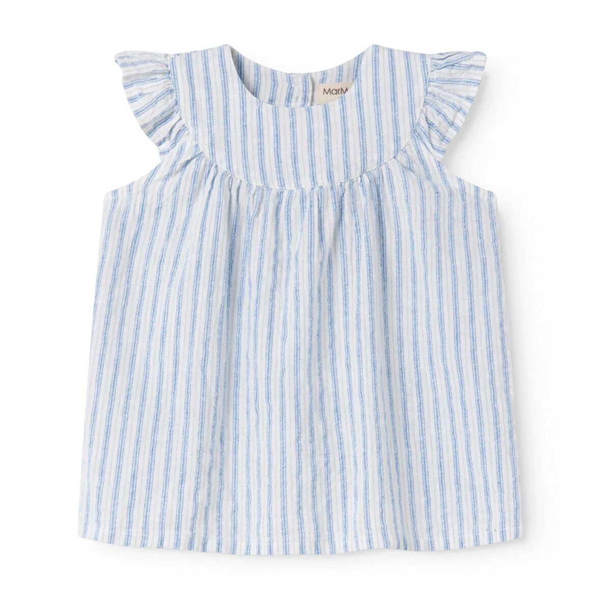 Sød og sommerlig ærmeløs babykjole med fine striber og dekorative flæser på skuldrene, der giver et let og feminint udtryk. Den luftige pasform sikrer god bevægelsesfrihed og høj komfort på varme dage.