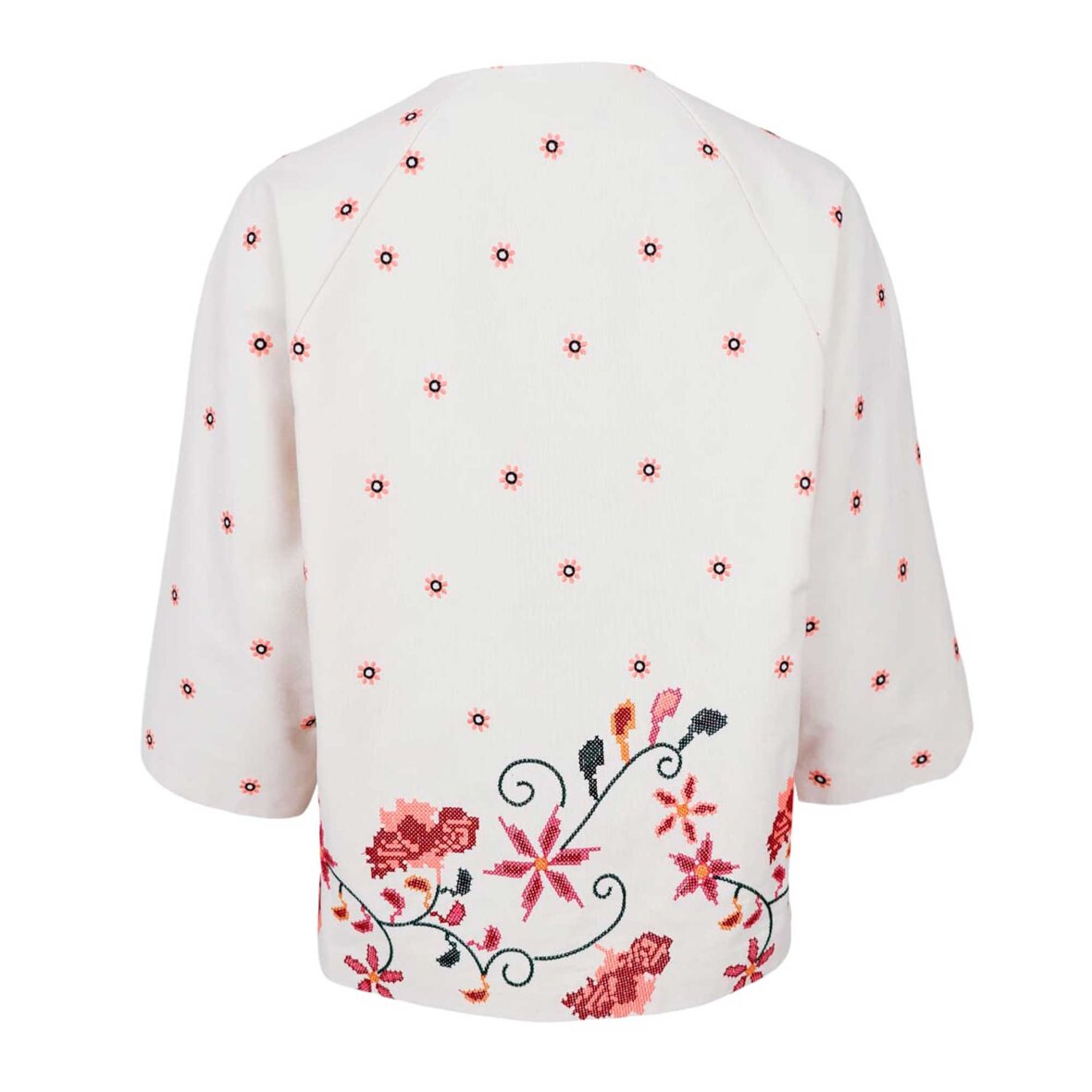 Smuk bomuldsjakke med fine cross stitch-broderier, der giver et håndlavet og kunstnerisk udtryk. De dekorative detaljer tilfører jakken karakter og gør den til et unikt statement-piece i garderoben.