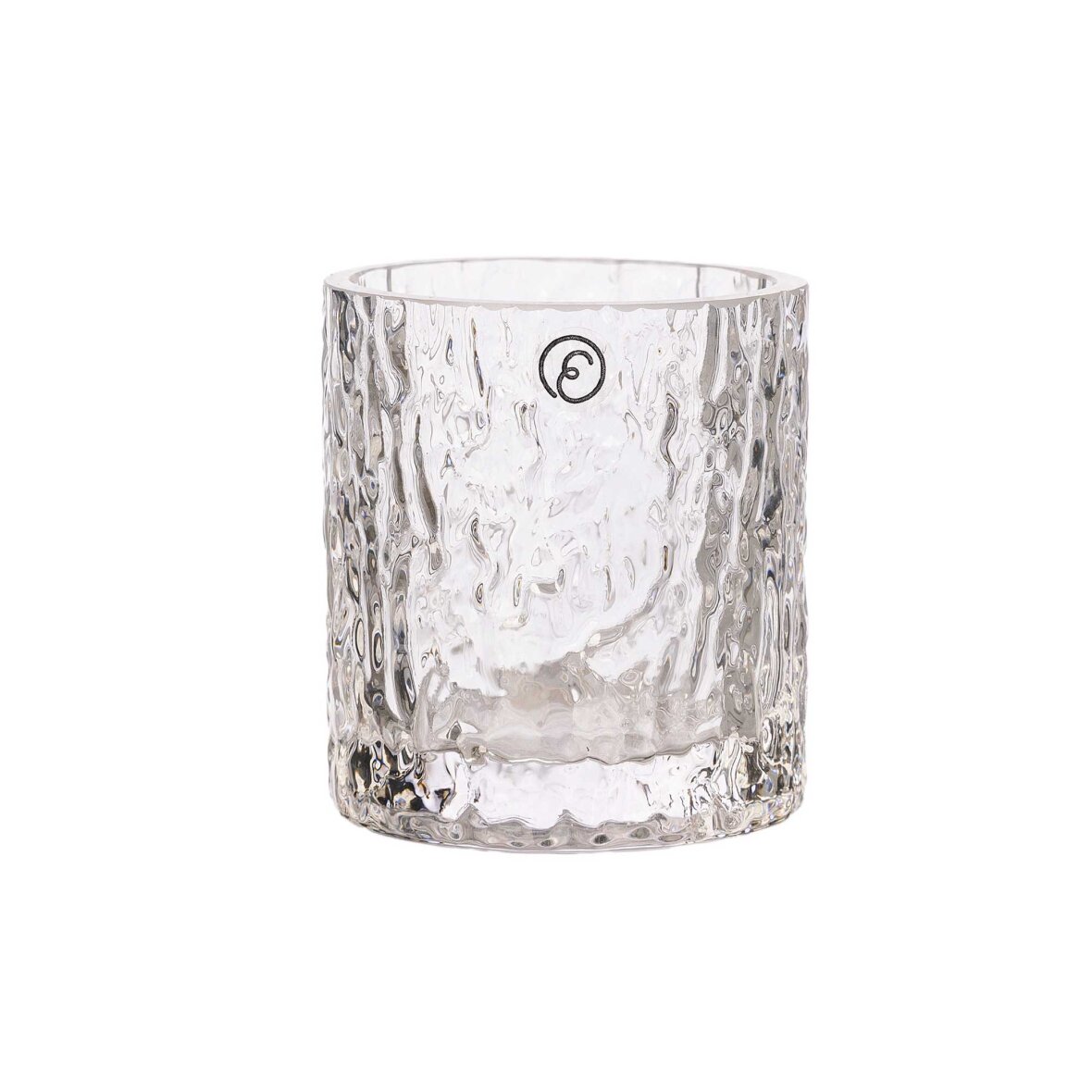 Lille glasvase med et smukt mønster, der fanger lyset og skaber en varm og stemningsfuld effekt. Perfekt til en enkelt blomst plukket på vejen hjem – eller som en hyggelig holder til et fyrfadslys.