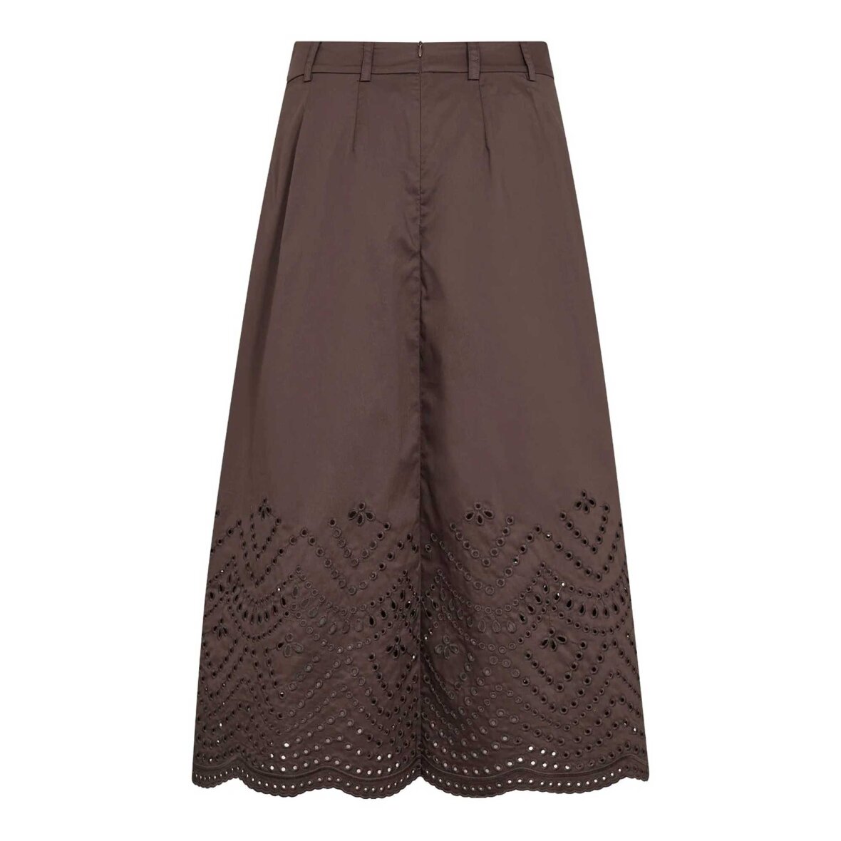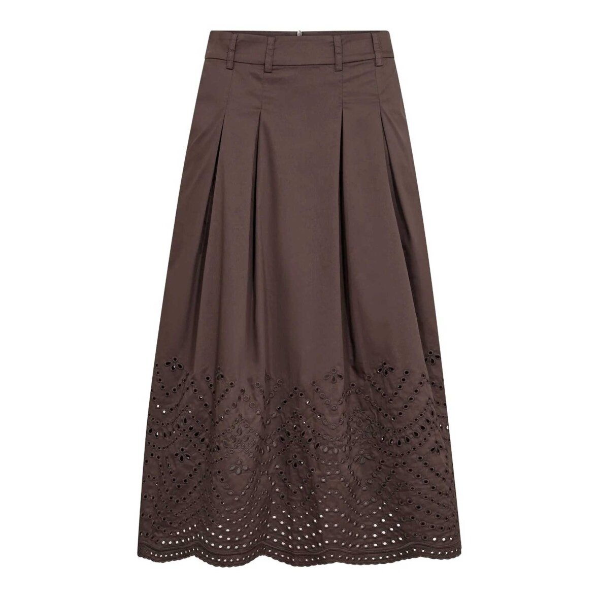 Feminin nederdel i en smuk mørkebrun farve med et elegant og let udtryk. De fine læg skaber bevægelse og et levende fald, mens den dekorative scallop-kant og anglaise broderi tilfører et blødt og detaljerigt finish.
