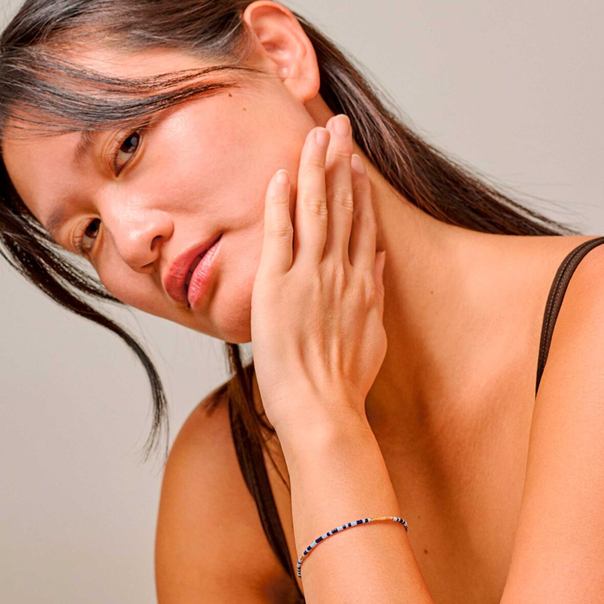 Den dybe mørkeblå farve kombineret med lyseblå detaljer skaber et levende, men balanceret udtryk. Sammen med de gyldne elementer får armbåndet en varm og elegant finish.