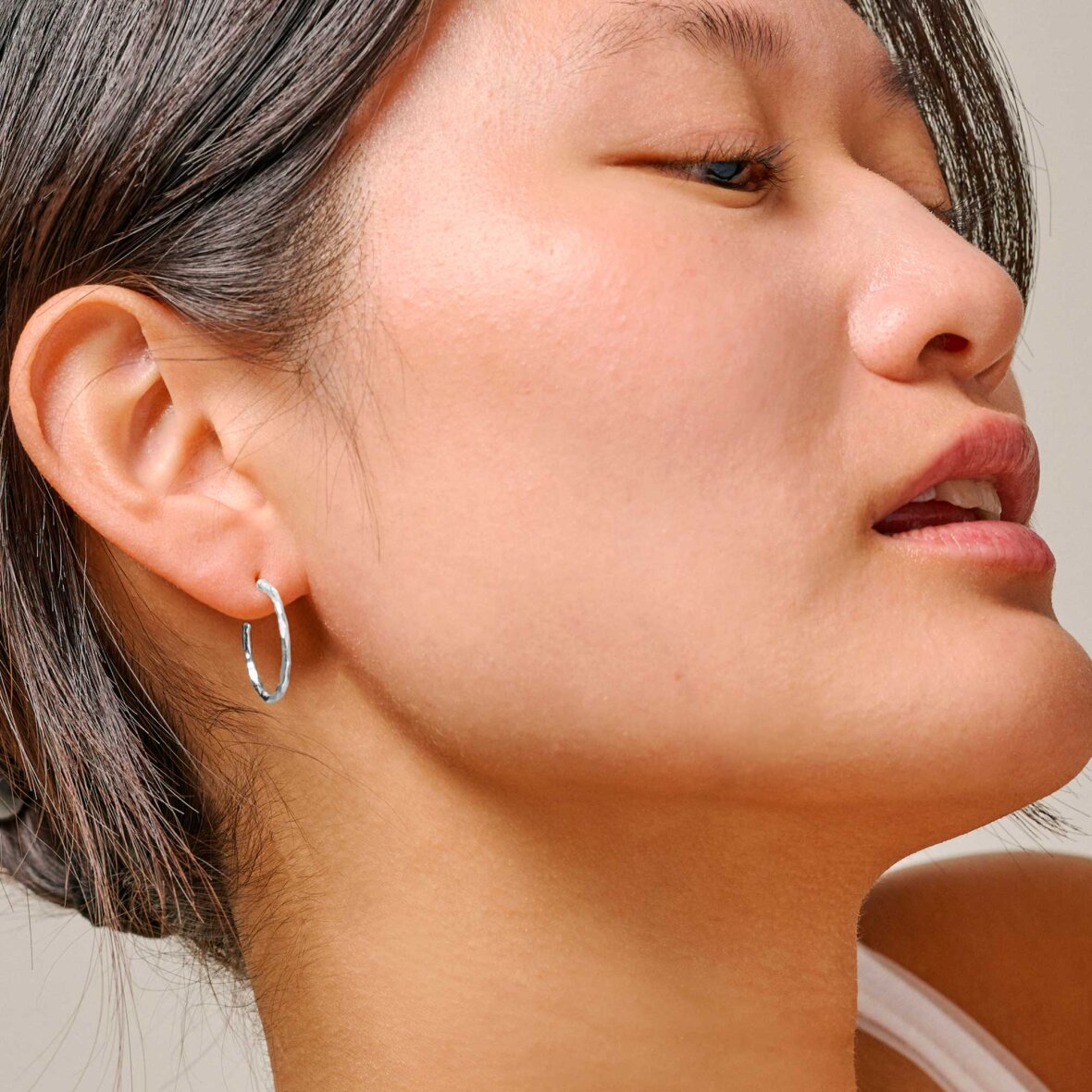 Organic Arena small hoops i sterlingsølv forener et enkelt design med rå elegance. Den hamrede overflade skaber et levende og organisk spil, der fanger lyset på en subtil måde. På trods af deres markante udtryk er de lette og behagelige at bære.