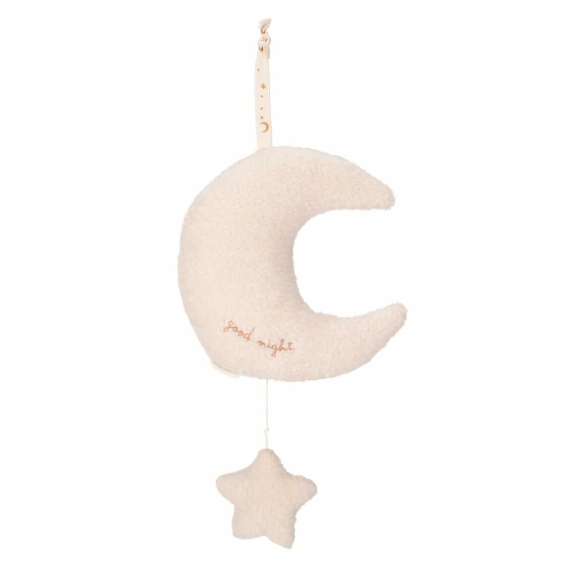 Lad dit barn falde til ro under en blid måne. Træk i snoren, og musikuroen spiller en beroligende melodi, der skaber en hyggelig og tryg stemning ved sengetid. Det bløde design og det fine ophæng gør den til en dekorativ og stemningsfuld detalje på børneværelset.