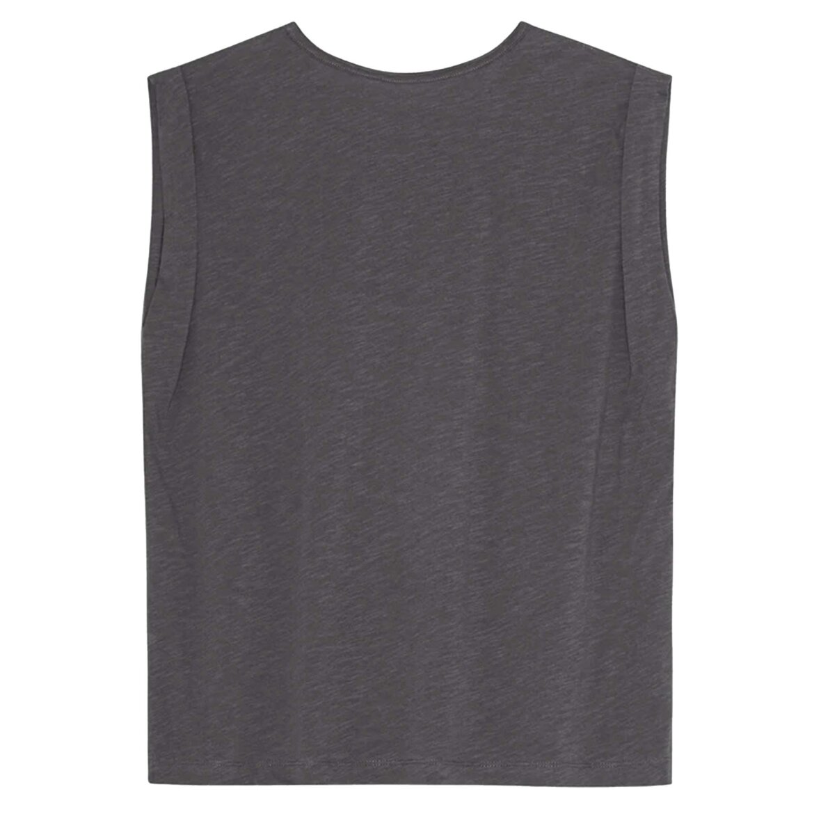Mørkegrå tanktop i løs pasform med rund hals. Det ærmeløse design kombineres med dekorativt læg og skuldersnit, som giver et moderne og afslappet udtryk. Perfekt som en alsidig basisstyle til både hverdag og lag-på-lag.