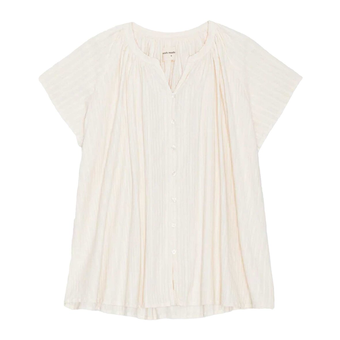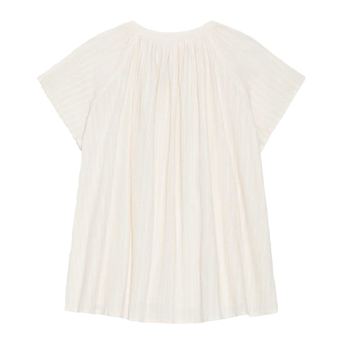 Klassisk hvid bluse i en let og rummelig pasform. Designet har korte, dekorative ærmer, fin dobby broderi og en let V-udskæring med gennemgående knaplukning. De små læg giver et smukt fald og understreger det luftige og feminine udtryk.