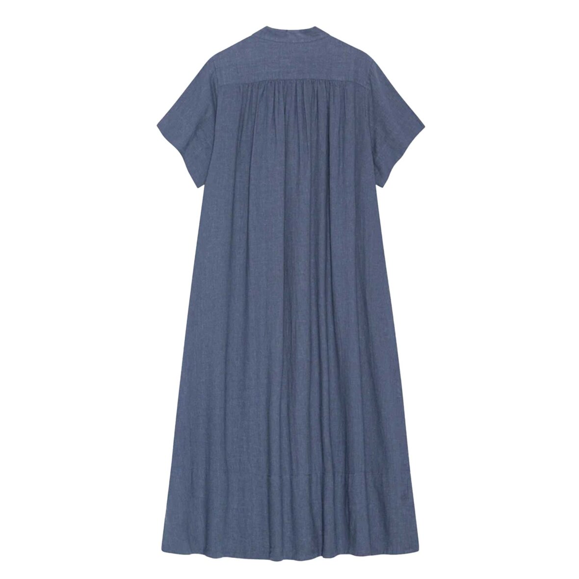 Feminin, A-formet skjortekjole i blå med diskret kinakrave og voluminøse korte ærmer. Den gennemgående knaplukning og de fine blondedetaljer ved ærmer og bund giver et elegant og sommerligt udtryk. De dekorative fald for og bag skaber et smukt og let flow i kjolen.