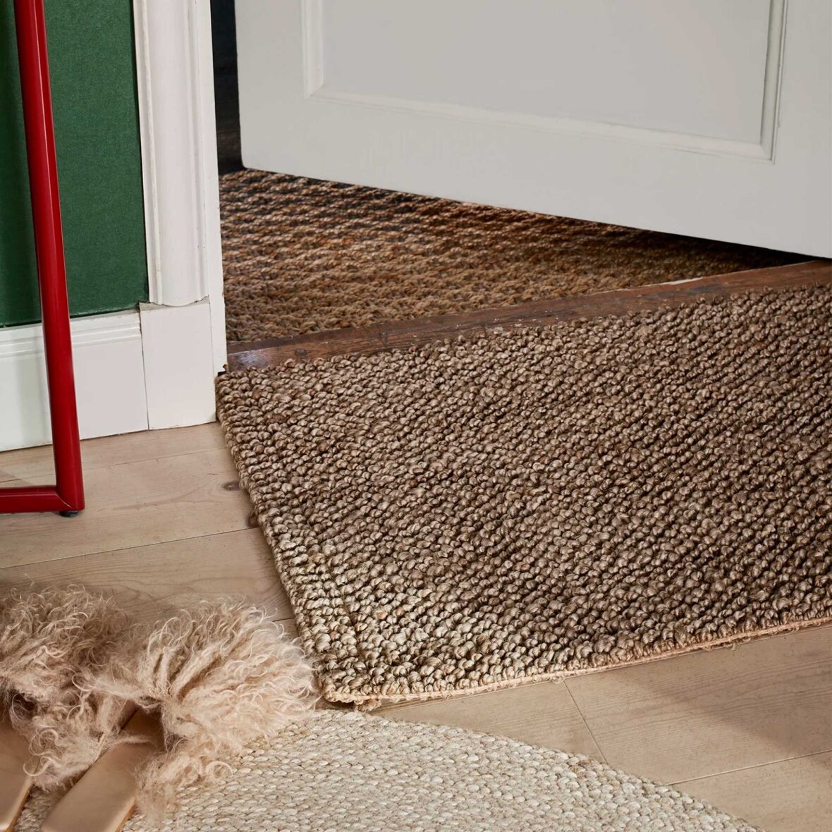 Eksklusiv dørmåtte i jute med et tidløst og stilrent design. Den tætvævede struktur med løkker giver et robust og dekorativt udtryk, perfekt til entréen. Håndvævet af dygtige håndværkere og afsluttet med en bagside i naturgummi, som sikrer skridsikker funktion.