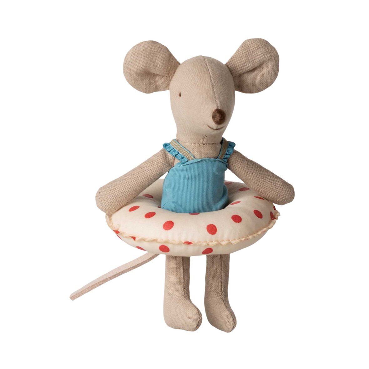 Sødt sommersæt med lillesøster mus iført badedragt og badering om maven. Hun er klar til en tryg svømmetur og masser af sommerleg. Perfekt til små fortællinger og leg med Maileg universet.