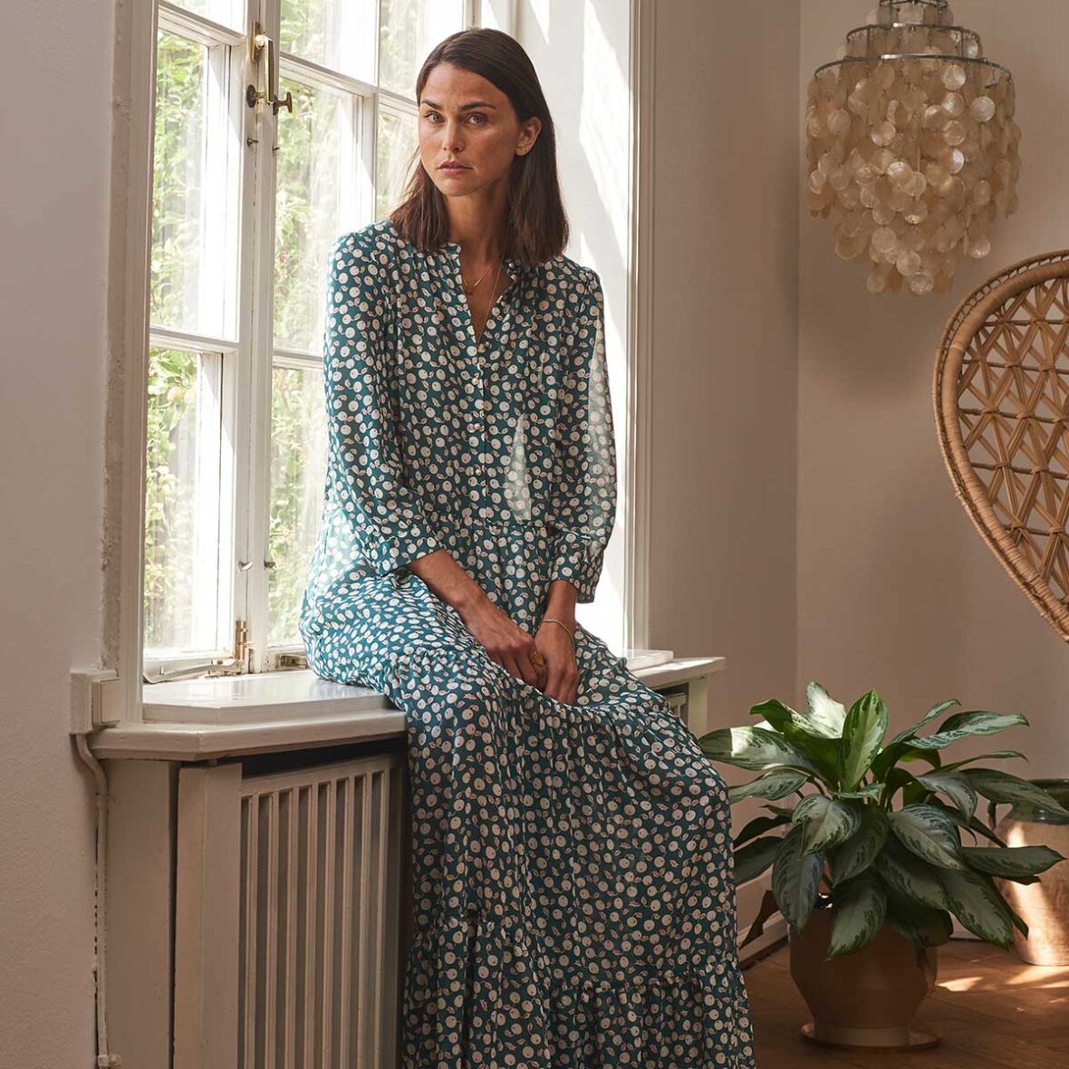 Nee maxikjolen fra Lollys Laundry i grønt let transparent print med hvide bær. Nee Kjole har rund halsudskæring og stolpelukning. Kjolen er med 3/4 ærmer og skåret i livet.