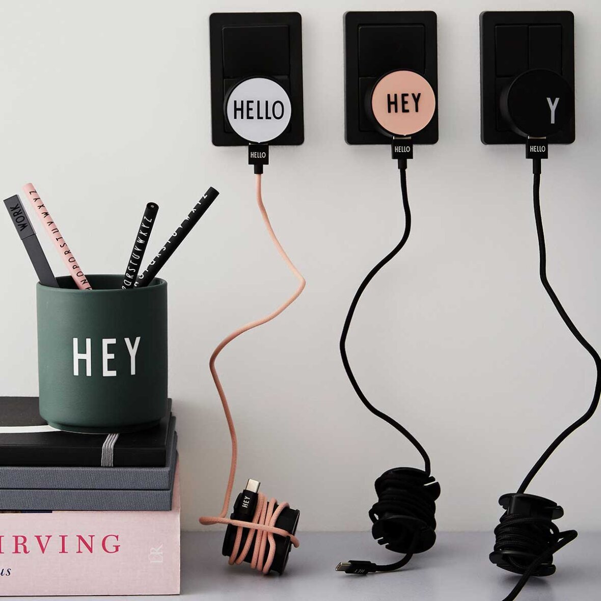 Style din telefon med stilfulde opladere i nude, grå og hvid.