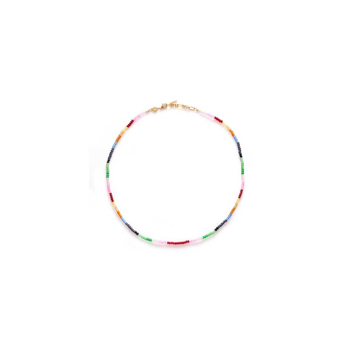 En rigtig fin halskæde af glasperler i alle regnbuens farver. I og med halskæden fra ANNI LU er spækfyldt med farver, er det et smykke man bliver i godt humør af at have på. Den er både rigtig fin til en varm sommerglød hud, men kan også sagtens bruges med strik eller andre varmere overdele. Længden på halskæden måler 46-49 cm, og er dermed også justerbar. Halskæden består af glasperler.
