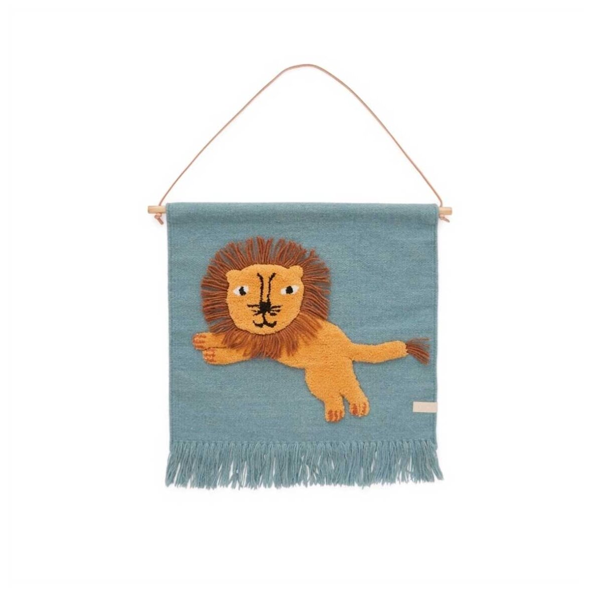 Dette fine vægtæppe med den springende løve vil være et hit i ethvert børneværelse. Det dekorative tæppe vil pynte og sprede god energi. Den håndlavede tæppe er lavet af uld og bomuld med fine detaljer, som et barn elsker. Træpinden er inkluderet.