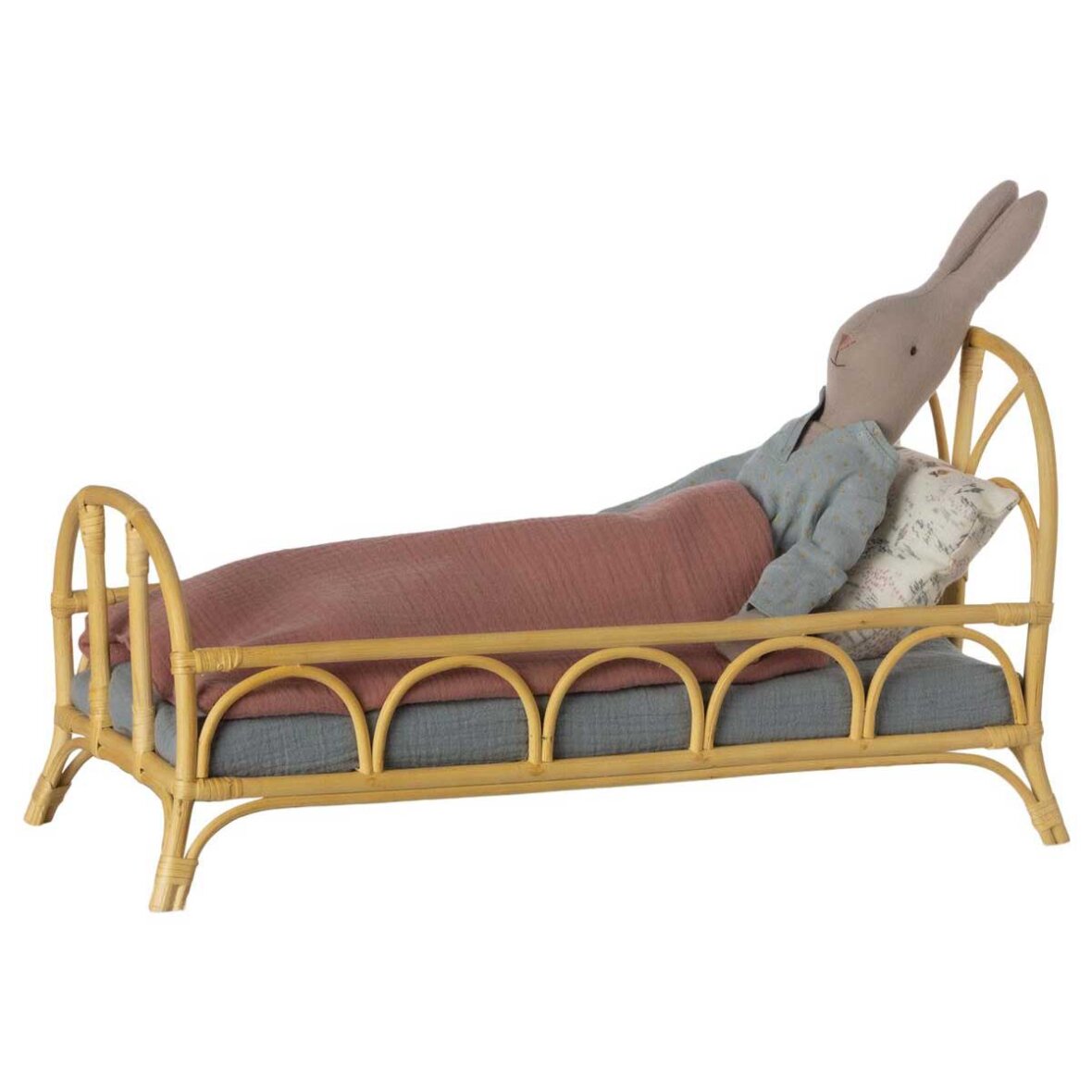 Flot seng fra Maileg. Sengen er super flot, den har en blå madras, en mønstret pude og en gammelrose farvet dyne. Med denne seng kan kaninen sove trygt og dejligt.