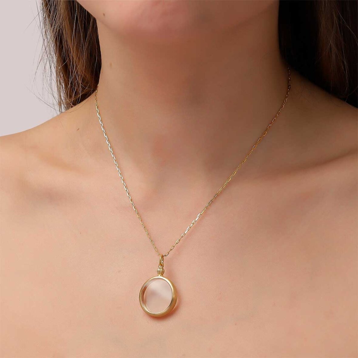 Jane Kønig har valgt at tilføje en lille twist til den klassiske medaljon i form af en gennemsigtig overflade. Dette smykker er helt unikt og giver plads til personlighed, da du kan gemme dine minder heri. Ved at åbne vedhænget, kan du indsætte et lille billede eller andet, som har personlig betydning for dig