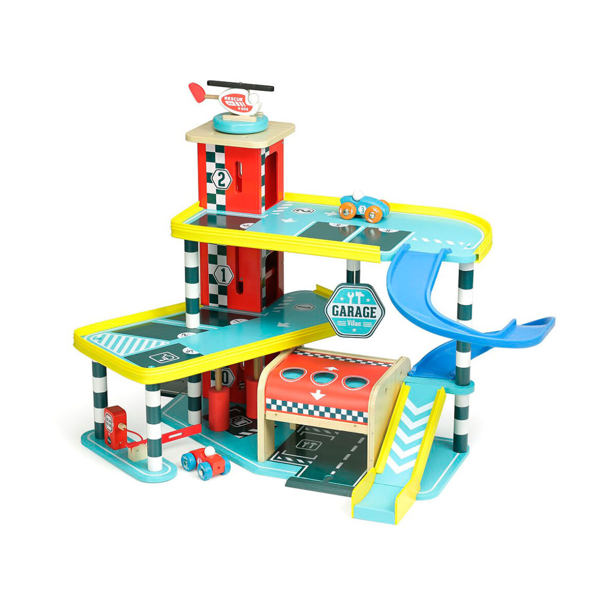 Denne flotte legetøjsgarage i træ er i tre niveauer med elevator, der giver nem adgang for køretøjer, når de suser fra niveau til niveau. På nederste niveau er der tankstation samt bilvask. Masser af sjov for små bilentusiaster.