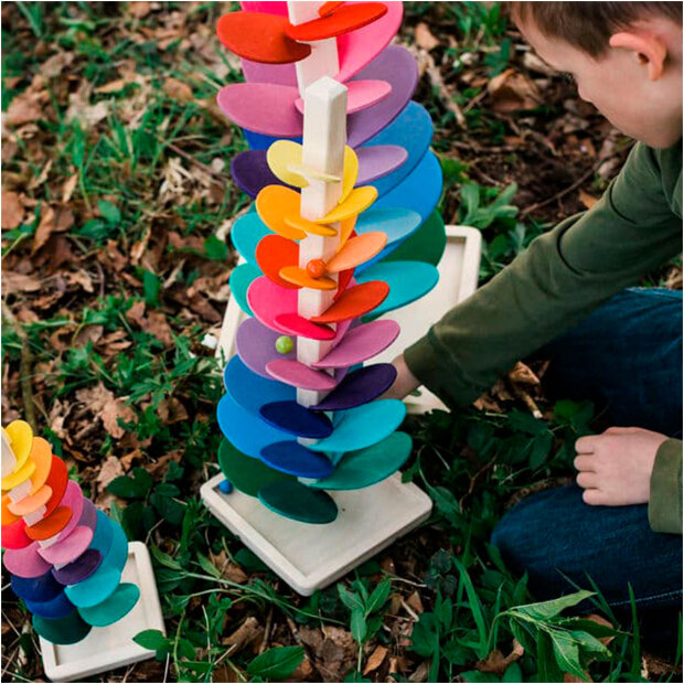 Smukt klangtræ med seks kugler i forskellige farver, der giver den mest fantastiske, lille, fine lyd, når kuglerne triller ned ad de farverige blade.