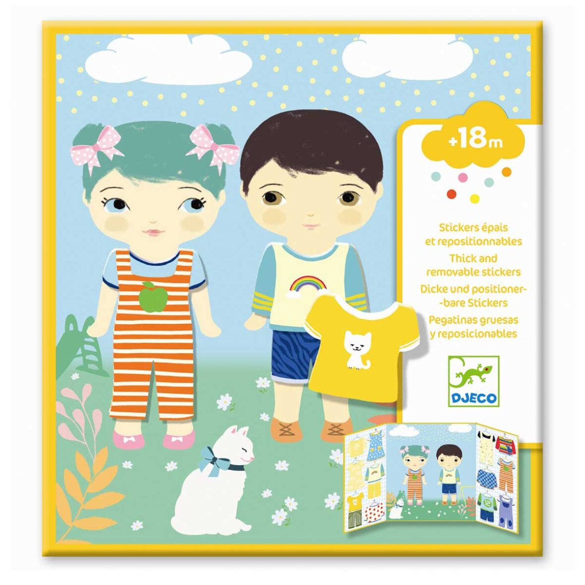 De tykke klistermærker med tøj kan sættes på pigen og drengen igen og igen.