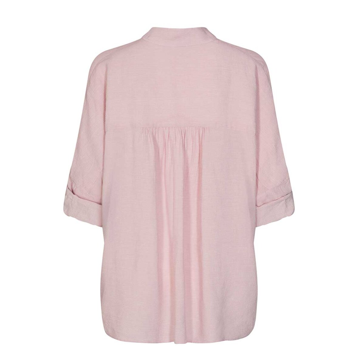 Lækker bluse fra Mos Mosh i en dejlig viskose- og hørblanding. Blusen har v-udskæring, korte ærmer med opsmøg og overskæring bagpå, der skaber et fint fald.